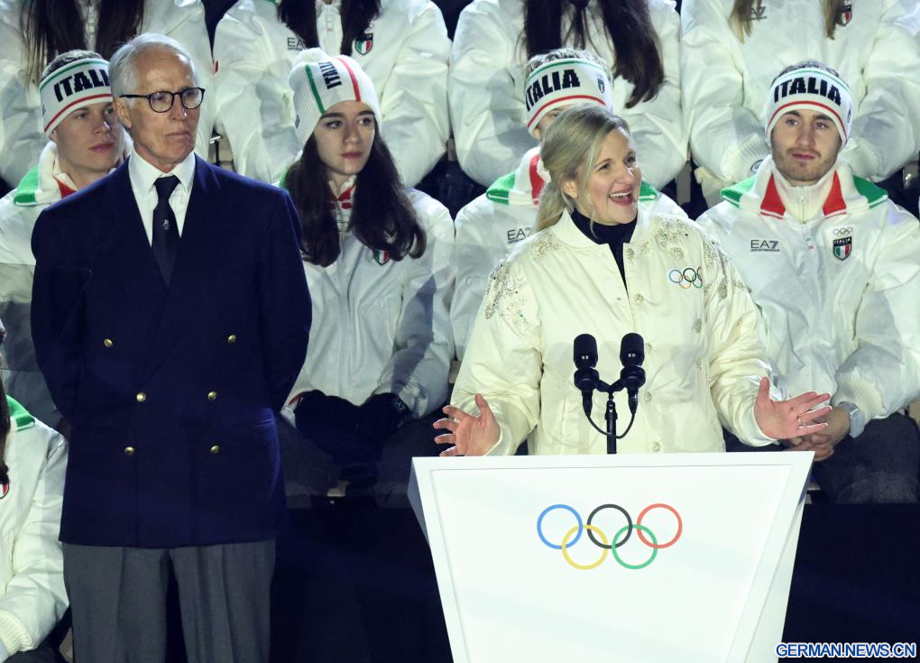 VERONA, 22. Februar 2026 (Xinhuanet) -- Die Präsidentin des Internationalen Olympischen Komitees (IOC), Kirsty Coventry, hält eine Rede bei der Abschlussfeier der Olympischen Winterspiele 2026 in Mailand-Cortina in der Verona Olympic Arena in Verona, Italien, 22. Februar 2026. (Quelle: Xinhua/Li Jing)