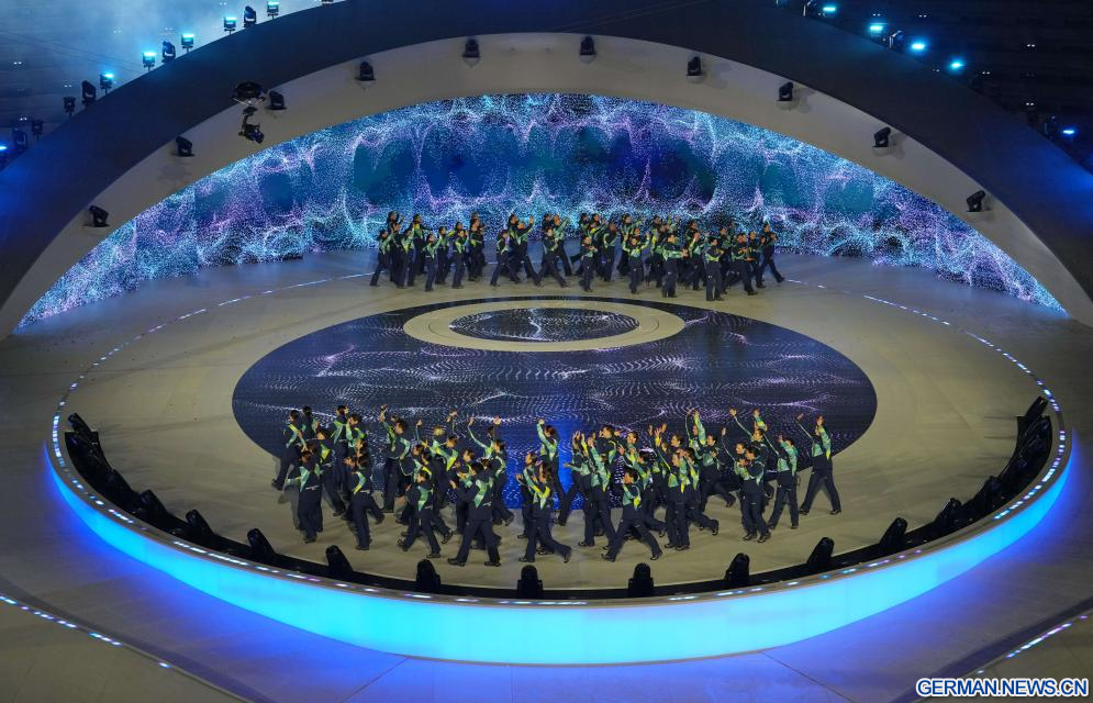 VERONA, 22. Februar 2026 (Xinhuanet) -- Schauspieler treten während der Abschlussfeier der Olympischen Winterspiele 2026 in Mailand-Cortina in der Verona Olympic Arena in Verona, Italien, auf, 22. Februar 2026. (Quelle: Xinhua/Xue Yuge)