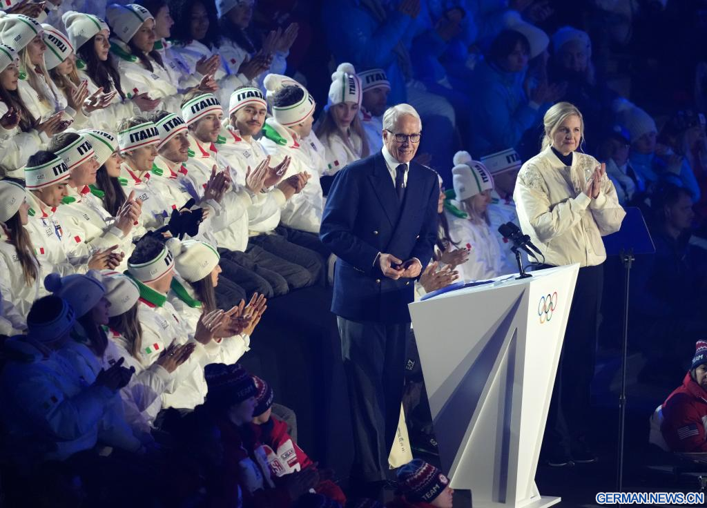 VERONA, 22. Februar 2026 (Xinhuanet) -- Giovanni Malago, Präsident des Organisationskomitees von Mailand-Cortina 2026, hält eine Rede bei der Abschlussfeier der Olympischen Winterspiele 2026 in Mailand-Cortina in der Verona Olympic Arena in Verona, Italien, 22. Februar 2026. (Quelle: Xinhua/Xue Yuge)