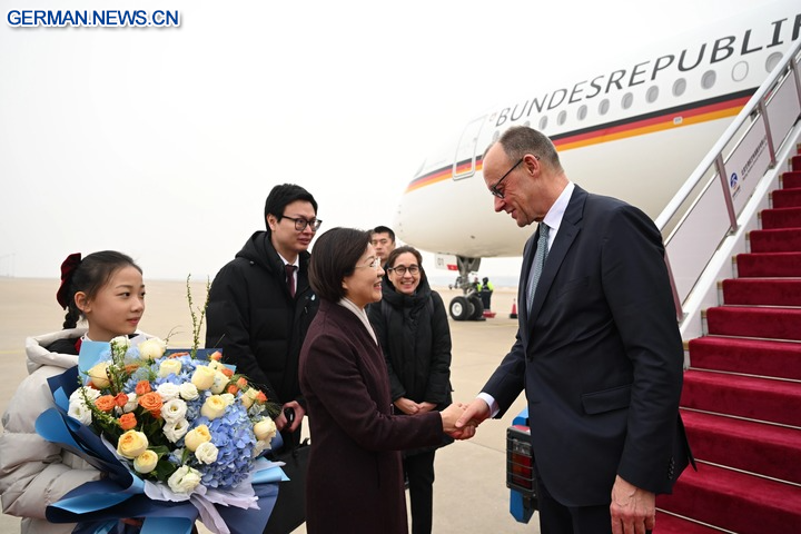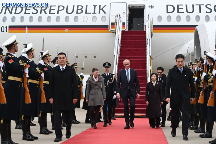 BEIJING, 25. Februar 2026 (Xinhua) -- Bundeskanzler Friedrich Merz trifft in der chinesischen Hauptstadt Beijing ein, 25. Februar 2026. Merz traf am Mittwoch zu einem bis Donnerstag dauernden offiziellen Besuch in China ein. (Xinhua/Dai Tianfang)