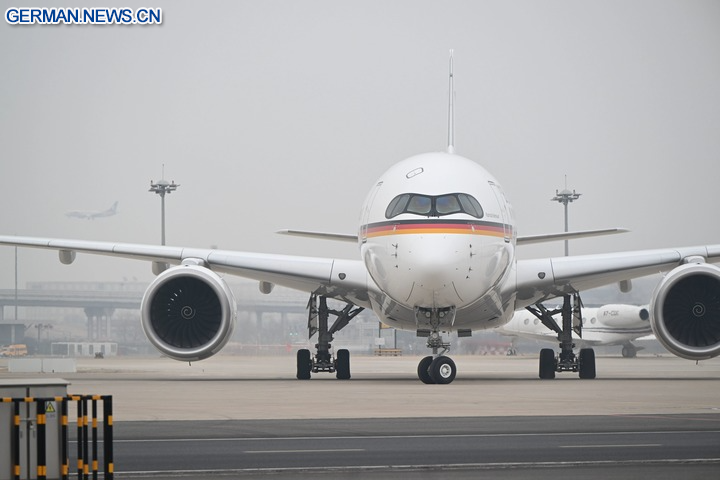 BEIJING, 25. Februar 2026 (Xinhua) -- Das Flugzeug von Bundeskanzler Friedrich Merz trifft in der chinesischen Hauptstadt Beijing ein, 25. Februar 2026. Merz traf am Mittwoch zu einem bis Donnerstag dauernden offiziellen Besuch in China ein. (Xinhua/Dai Tianfang)