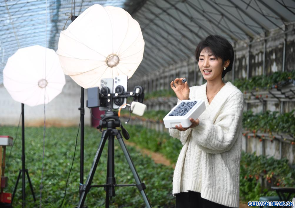 BEIJING, 26. Februar 2026 (Xinhuanet) -- Eine Frau wirbt per Live-Streaming für Blaubeeren in einem Gewächshaus im Bezirk Pinggu der chinesischen Hauptstadt Beijing, 26. Februar 2026. Mit der Reifung der Gewächshaus-Blaubeeren im Bezirk Pinggu in Beijing steigern die lokalen Arbeiter den Absatz durch Live-Streaming-E-Commerce und Agrotourismus-Programme. (Quelle: Xinhua/Ren Chao)