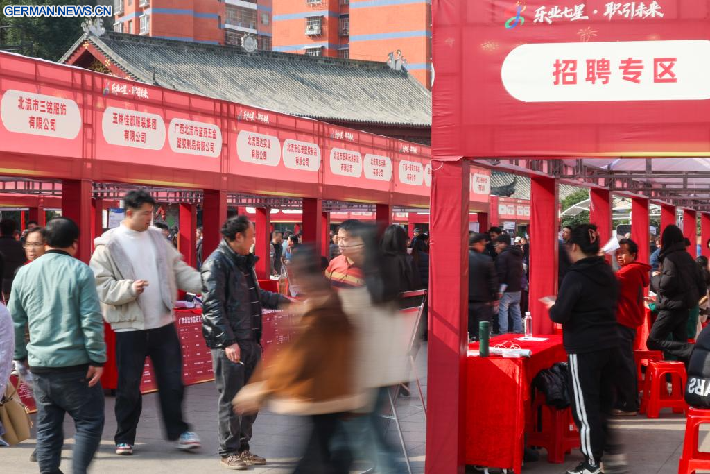 BEIJING, 27. Februar 2026 (Xinhuanet) -- Arbeitssuchende informieren sich über die Stellenangebote auf einer Jobmesse in Liangjiang New Area in Chongqing in Südwestchina, 27. Februar 2026. In jüngster Zeit wurden im ganzen Land verschiedene Arten von Jobmessen abgehalten, um Arbeitssuchenden Stellenangebote zu vermitteln. (Quelle: Xinhua/Chen Cheng)
