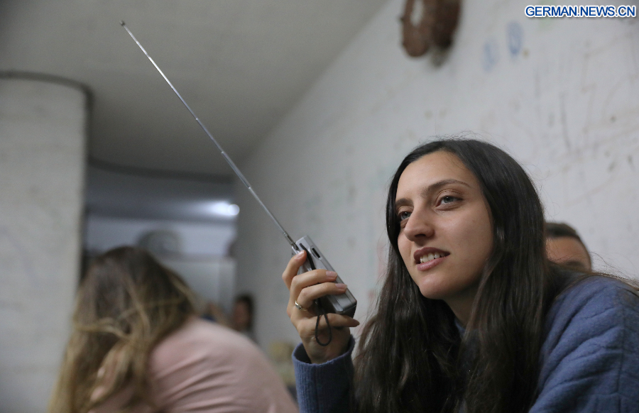 TEL AVIV, 1. März 2026 (Xinhua) -- Eine Frau hört Radio in einem Schutzraum in Tel Aviv in Israel, 28. Februar 2026. Das Heimatschutzkommando der israelischen Streitkräfte hat Zivilschutzanweisungen erteilt, als in mehreren Gebieten des Landes Luftschutzsirenen ertönten, und Einwohner aufgefordert, Schutz zu suchen.