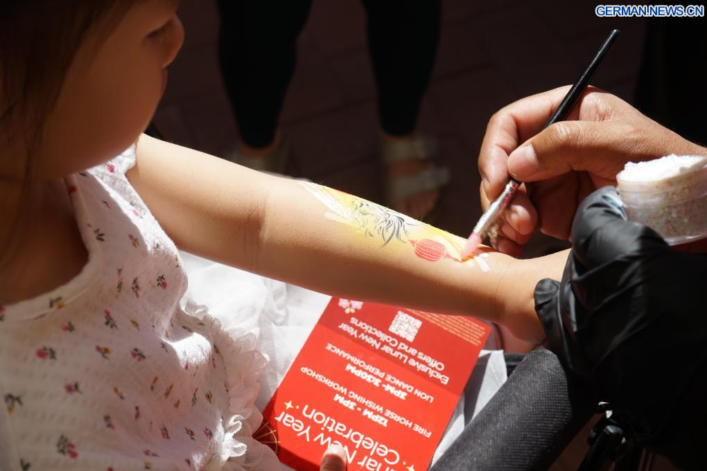NEWPORT BEACH, 1. März 2026 (Xinhuanet) -- Ein Mädchen probiert Körperbemalung auf einer Winterreise-Messe aus, die vom Chinesischen Nationalen Tourismusbüro in Los Angeles in Newport Beach, Kalifornien, den Vereinigten Staaten, veranstaltet wurde, 28. Februar 2026. (Foto von Zeng Hui/Xinhua)