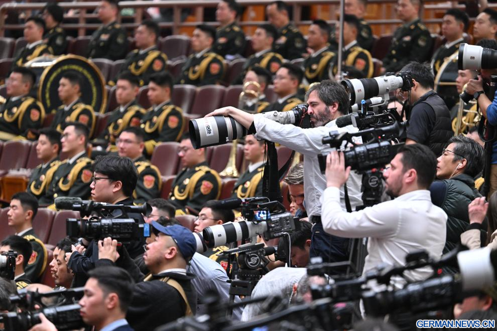 BEIJING, 5. März 2026 (Xinhuanet) -- Journalisten arbeiten bei der Eröffnungssitzung der vierten Tagung des 14. Nationalen Volkskongresses (NVK) in der Großen Halle des Volkes in Chinas Hauptstadt Beijing, 5. März 2026. (Quelle: Xinhua/Li Xin)
