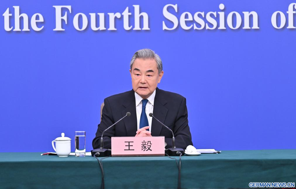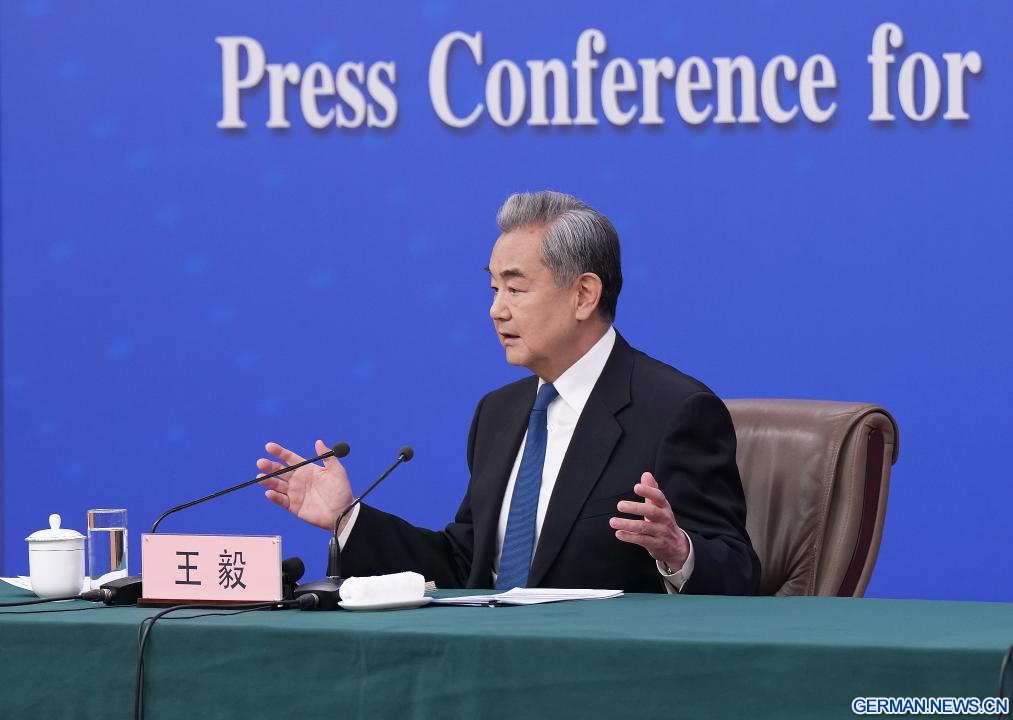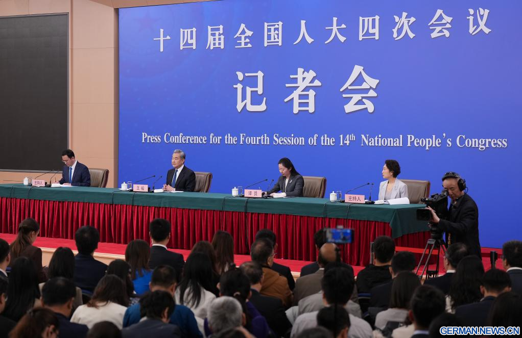 BEIJING, 8. März 2026 (Xinhuanet) -- Der chinesische Außenminister Wang Yi, ebenfalls Mitglied des Politbüros des Zentralkomitees der Kommunistischen Partei Chinas (KPCh), nimmt am Rande der vierten Tagung des 14. Nationalen Volkskongresses (NVK) an einer Pressekonferenz zur Außenpolitik und zu den Außenbeziehungen Chinas in der chinesischen Hauptstadt Beijing teil, 8. März 2026. (Quelle: Xinhua/Cao Yiming)