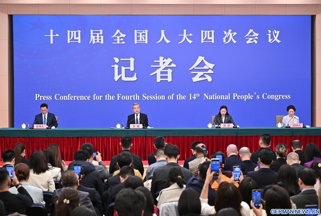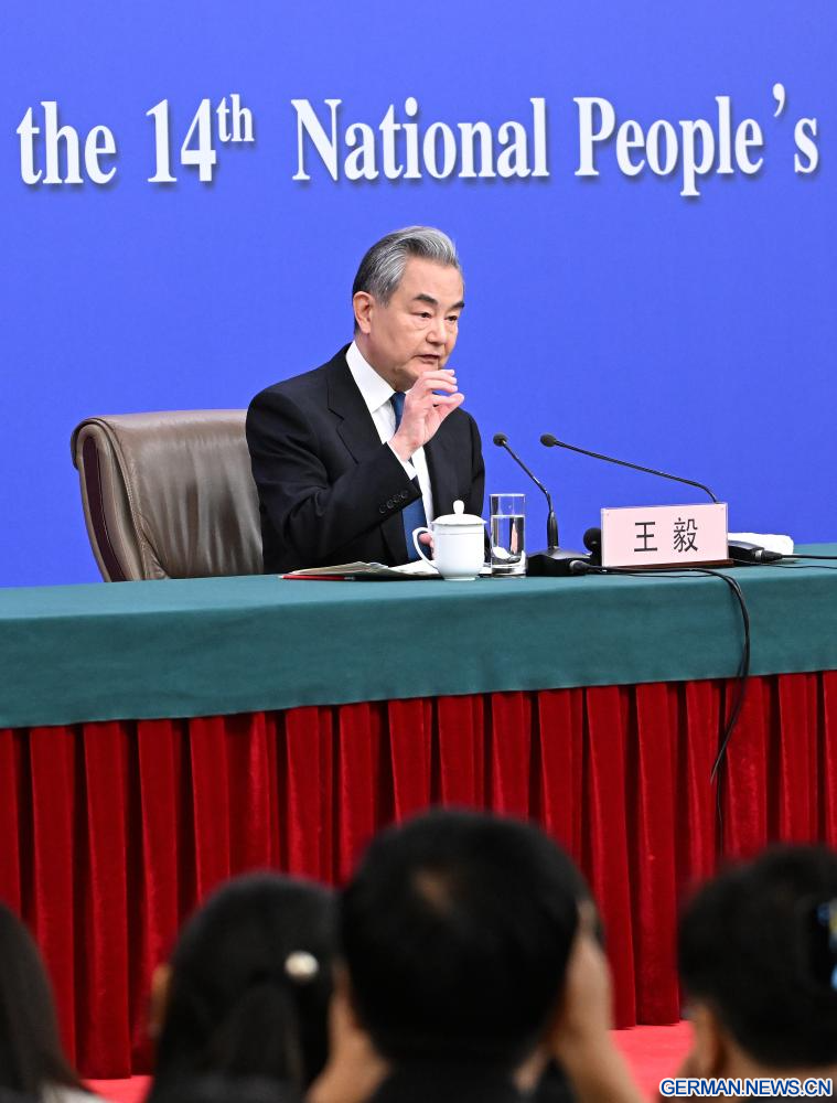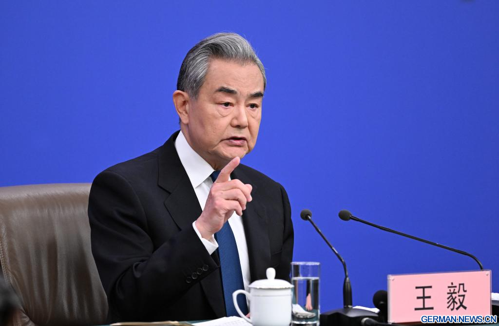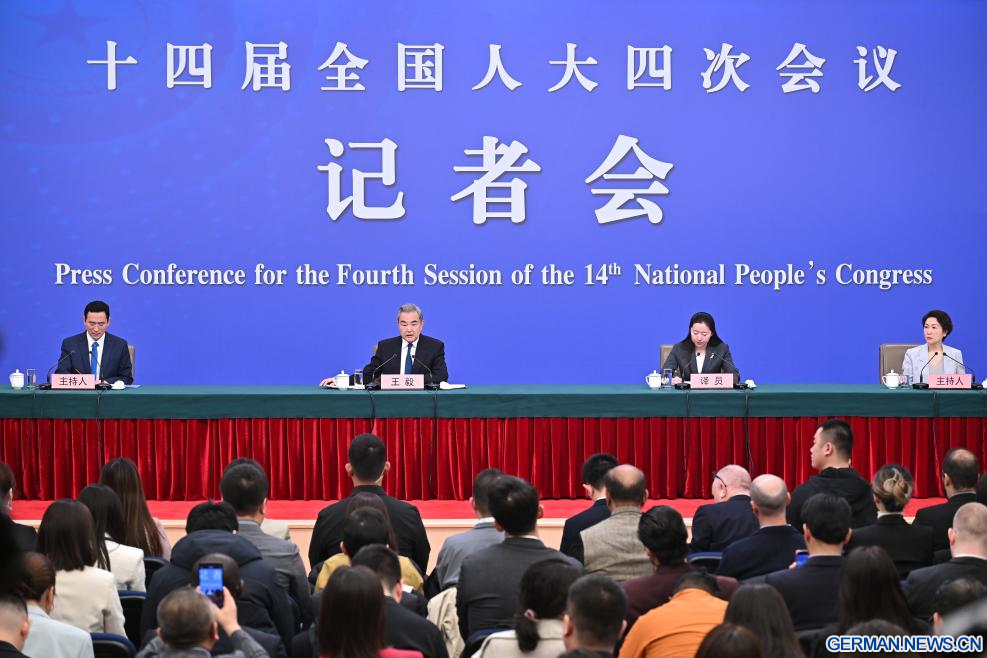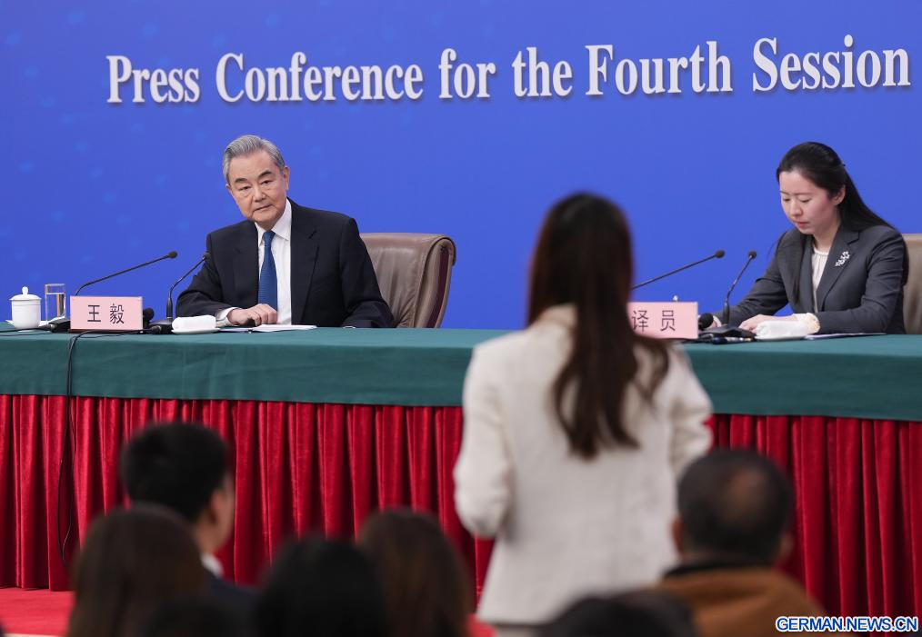 BEIJING, 8. März 2026 (Xinhuanet) -- Der chinesische Außenminister Wang Yi, ebenfalls Mitglied des Politbüros des Zentralkomitees der Kommunistischen Partei Chinas (KPCh), nimmt am Rande der vierten Tagung des 14. Nationalen Volkskongresses (NVK) an einer Pressekonferenz zur Außenpolitik und zu den Außenbeziehungen Chinas in der chinesischen Hauptstadt Beijing teil, 8. März 2026.(Quelle: Xinhua/Li Xin)