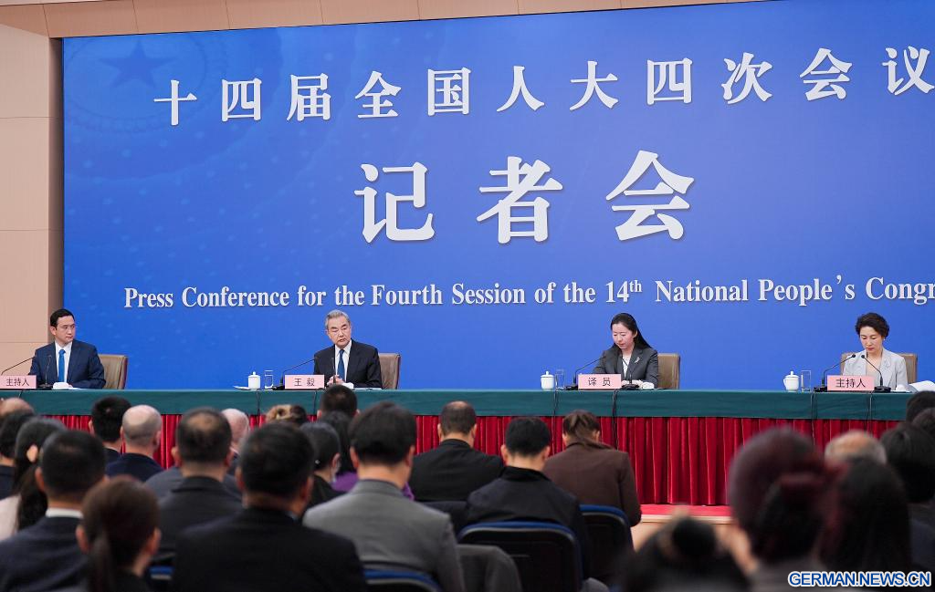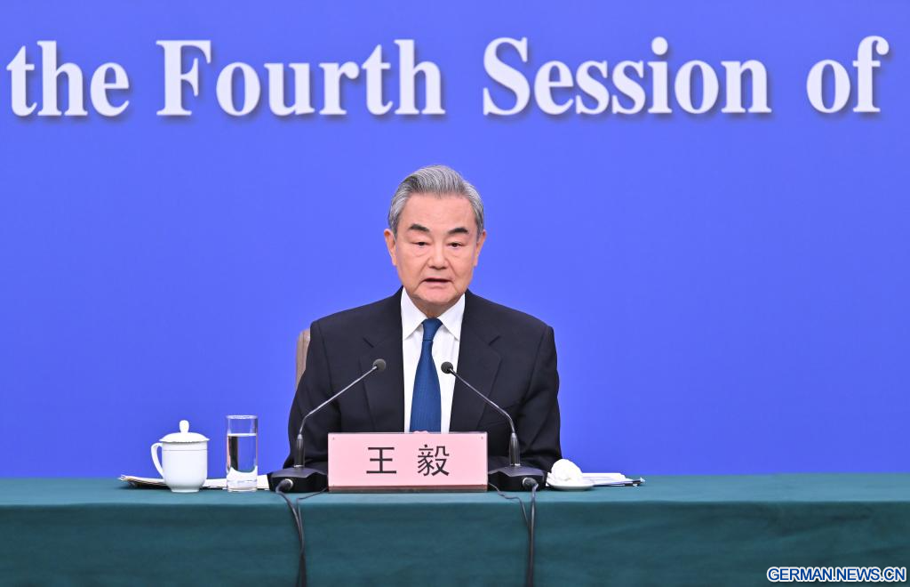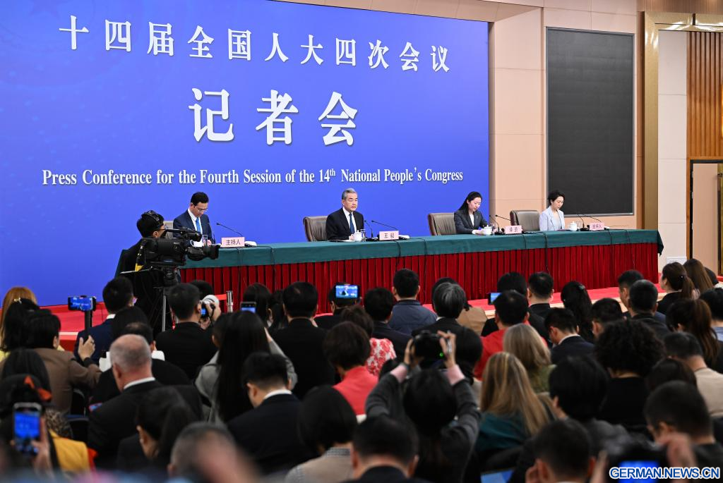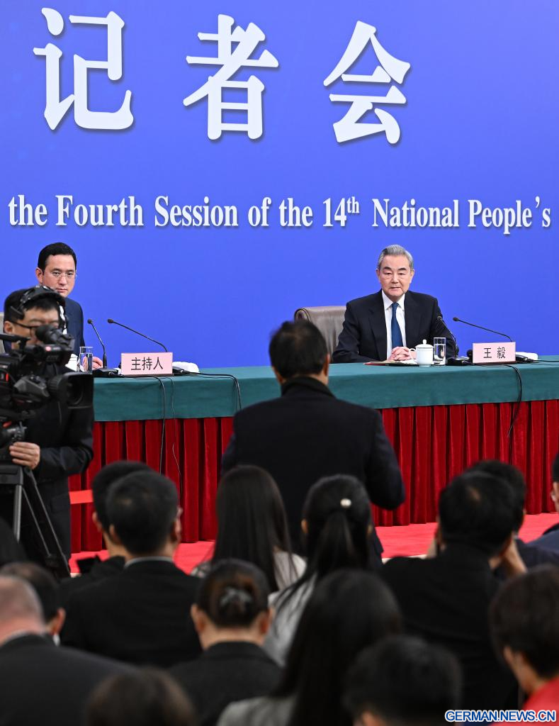 BEIJING, 8. März 2026 (Xinhuanet) -- Der chinesische Außenminister Wang Yi, ebenfalls Mitglied des Politbüros des Zentralkomitees der Kommunistischen Partei Chinas (KPCh), nimmt am Rande der vierten Tagung des 14. Nationalen Volkskongresses (NVK) an einer Pressekonferenz zur Außenpolitik und zu den Außenbeziehungen Chinas in der chinesischen Hauptstadt Beijing teil, 8. März 2026.(Quelle: Xinhua/Li Xin)
