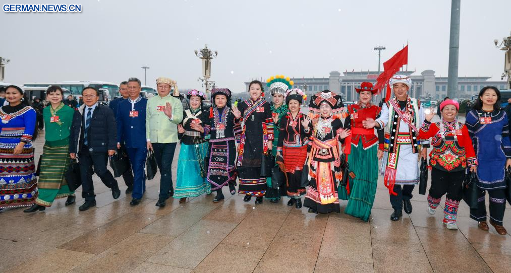 BEIJING, 8. März 2026 (Xinhuanet) -- Abgeordnete des 14. Nationalen Volkskongresses (NVK) begeben sich zur Großen Halle des Volkes, um an der Eröffnungssitzung der vierten Tagung des 14. NVK teilzunehmen, in Chinas Hauptstadt Beijing, 5. März 2026.
