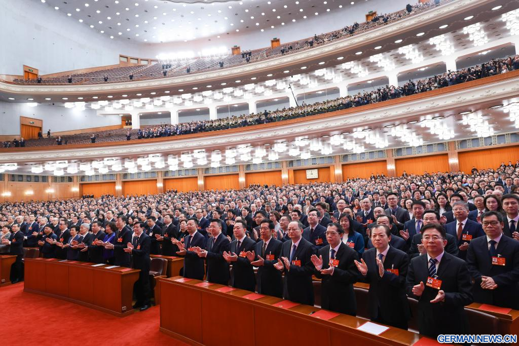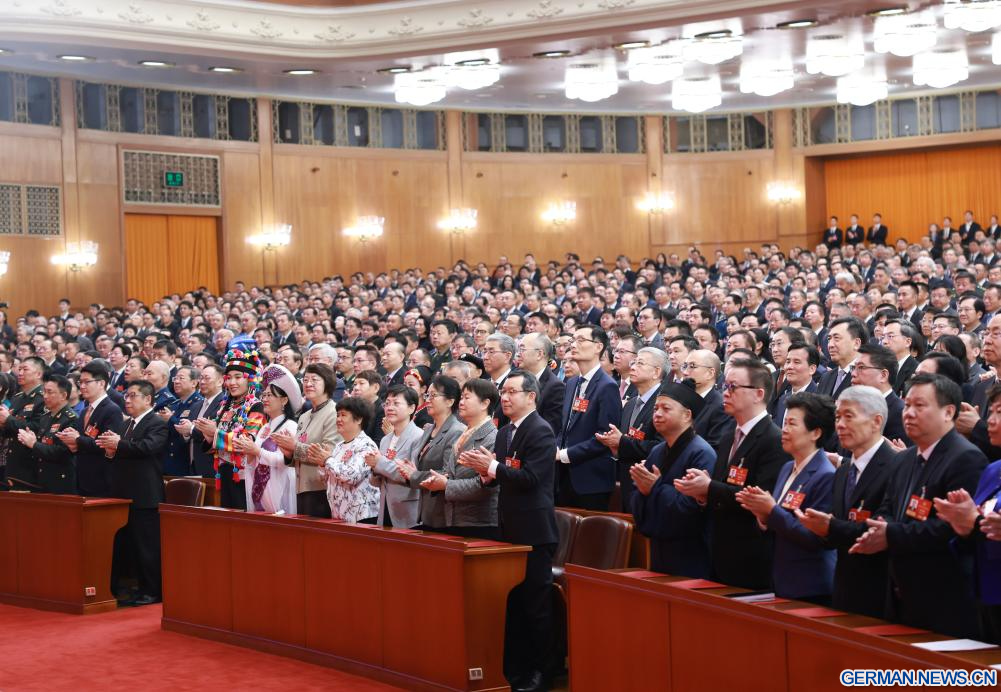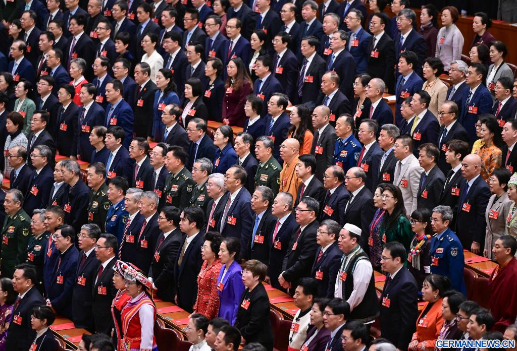 BEIJING, 11. März 2026 (Xinhuanet) -- Die vierte Tagung des 14. Landeskomitees der Politischen Konsultativkonferenz des Chinesischen Volkes (PKKCV) hält ihre Abschlusssitzung in der Großen Halle des Volkes in Chinas Hauptstadt Beijing ab, 11. März 2026. Xi Jinping und andere Führungspersönlichkeiten der Partei und des Staates, darunter Li Qiang, Zhao Leji, Cai Qi, Ding Xuexiang, Li Xi und Han Zheng, nahmen an der Sitzung teil. (Quelle: Xinhua/Yan Yan)