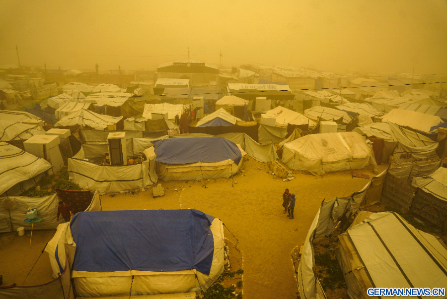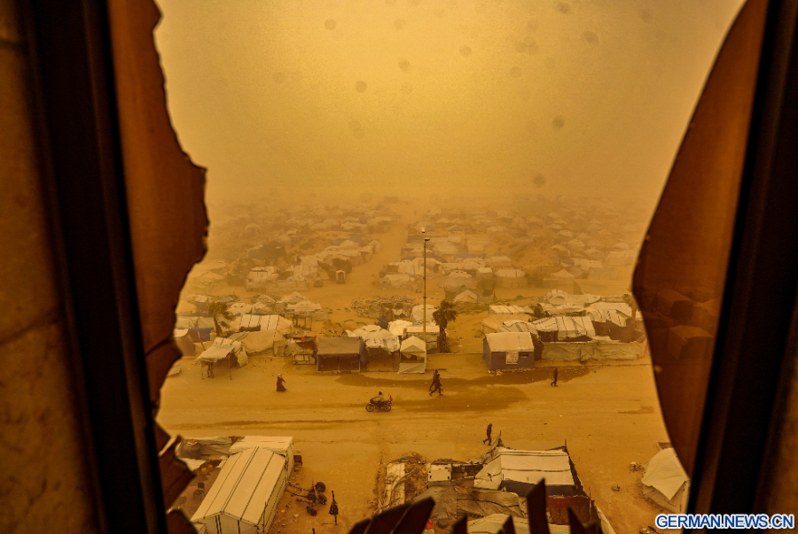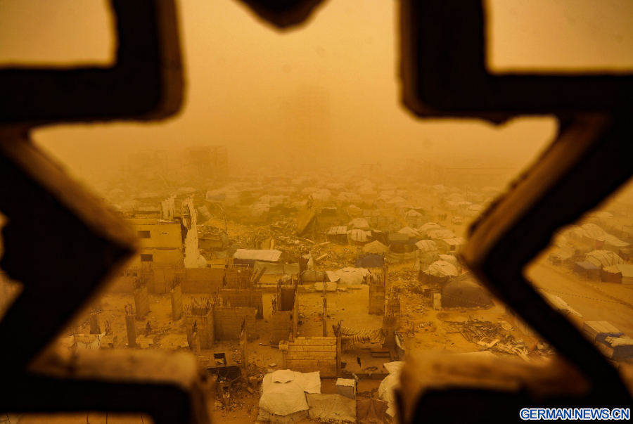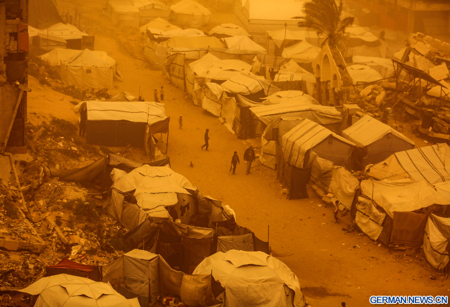 GAZA, 16. März 2026 (Xinhua) -- Palästinenser gehen durch einen Sandsturm in einem Lager für vertriebene Palästinenser im Westen von Gaza-Stadt, 14. März 2026. (Foto von Rizek Abdeljawad/Xinhua)
