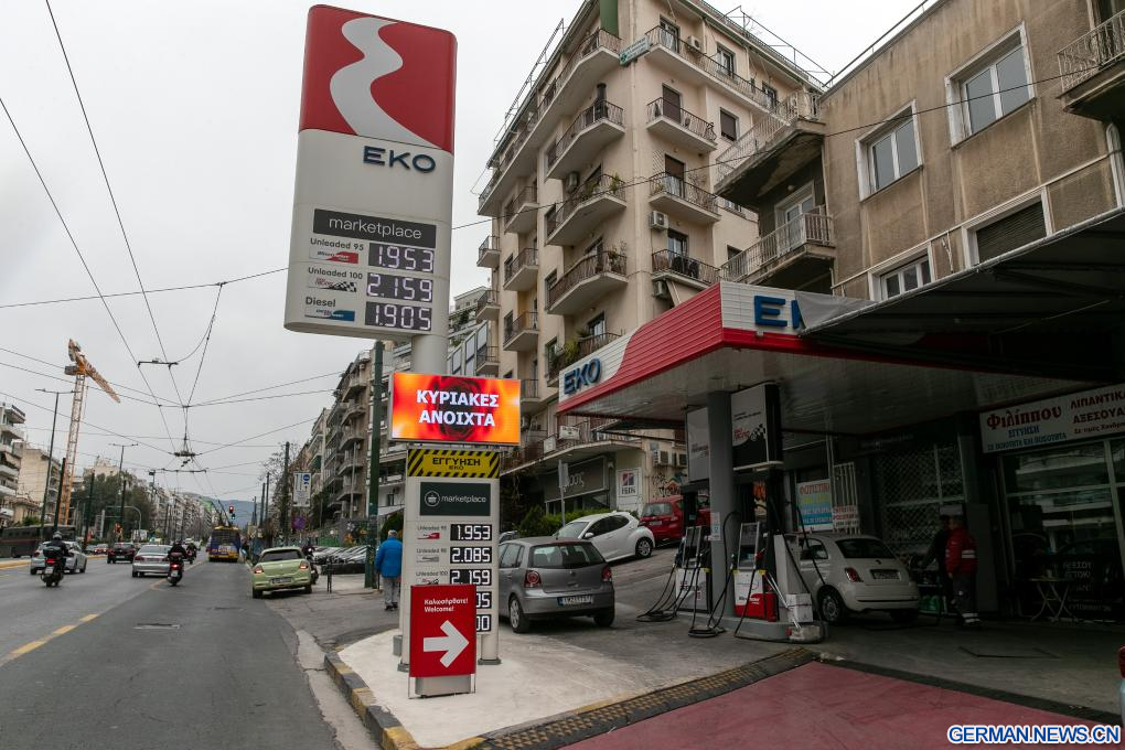 ATHEN, 17. März 2026 (Xinhuanet) -- Das am 17. März 2026 aufgenommene Foto zeigt die Benzinpreise, die an einer Tankstelle in Athen, Griechenland, angezeigt werden. Seit Beginn der militärischen Operationen der USA und des Israels gegen den Iran sind die Benzinpreise in Griechenland gestiegen. (Quelle: Xinhua/Marios Lolos)