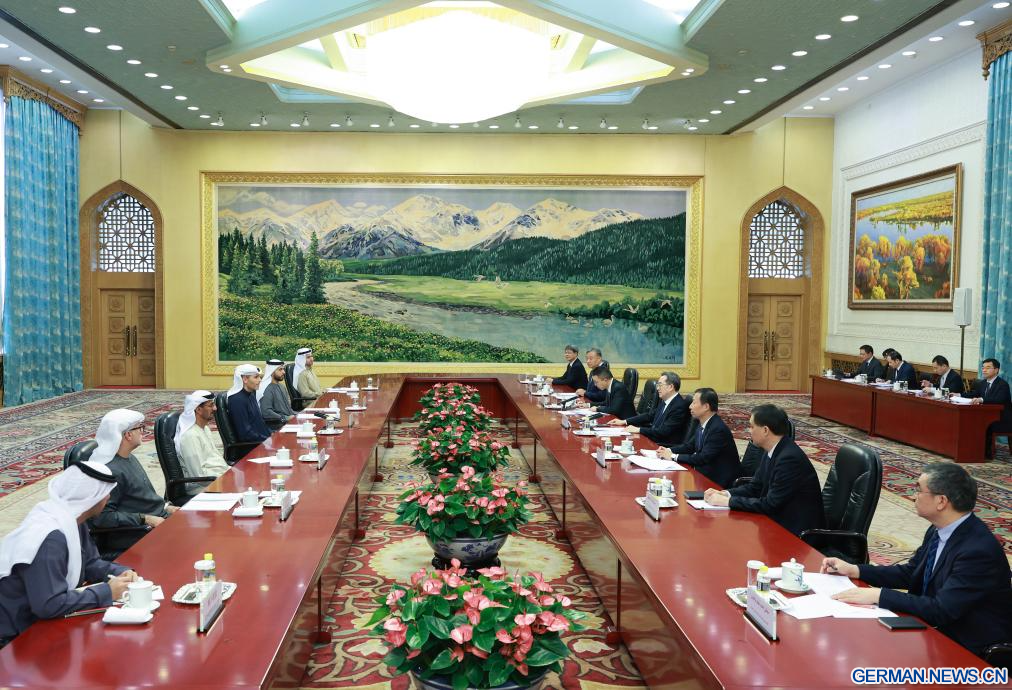 BEIJING, 18. März 2026 (Xinhuanet) -- Der chinesische Vize-Ministerpräsident Ding Xuexiang, ebenfalls Mitglied des Ständigen Ausschusses des Politbüros des Zentralkomitees der Kommunistischen Partei Chinas, trifft sich in der chinesischen Hauptstadt Beijing mit Khaldoon Khalifa Al Mubarak, dem Sonderbeauftragten des Präsidenten der Vereinigten Arabischen Emirate (VAE) für China, 18. März 2026. (Quelle: Xinhua/Wang Ye)
