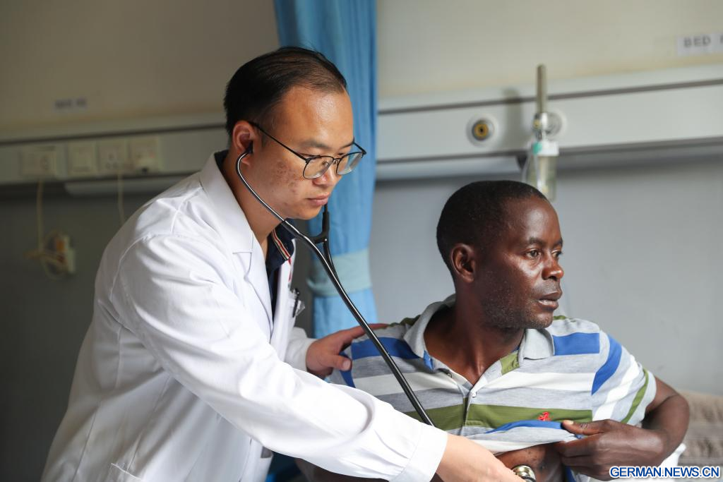 LUSAKA, 18. März 2026 (Xinhuanet) -- Ein chinesischer Arzt untersucht einen Patienten im Levy Mwanawasa University Teaching Hospital in Lusaka, Sambia, 17. März 2026. Das 26. chinesische Ärzteteam in Sambia traf im Juni 2025 in diesem afrikanischen Land ein. Das Team wurde in vier Gruppen aufgeteilt, die jeweils im University Teaching Hospital, im Levy Mwanawasa University Teaching Hospital, im Ndola Teaching Hospital und im Livingston Central Hospital tätig sind. (Quelle: Xinhua/Chen Wei)
