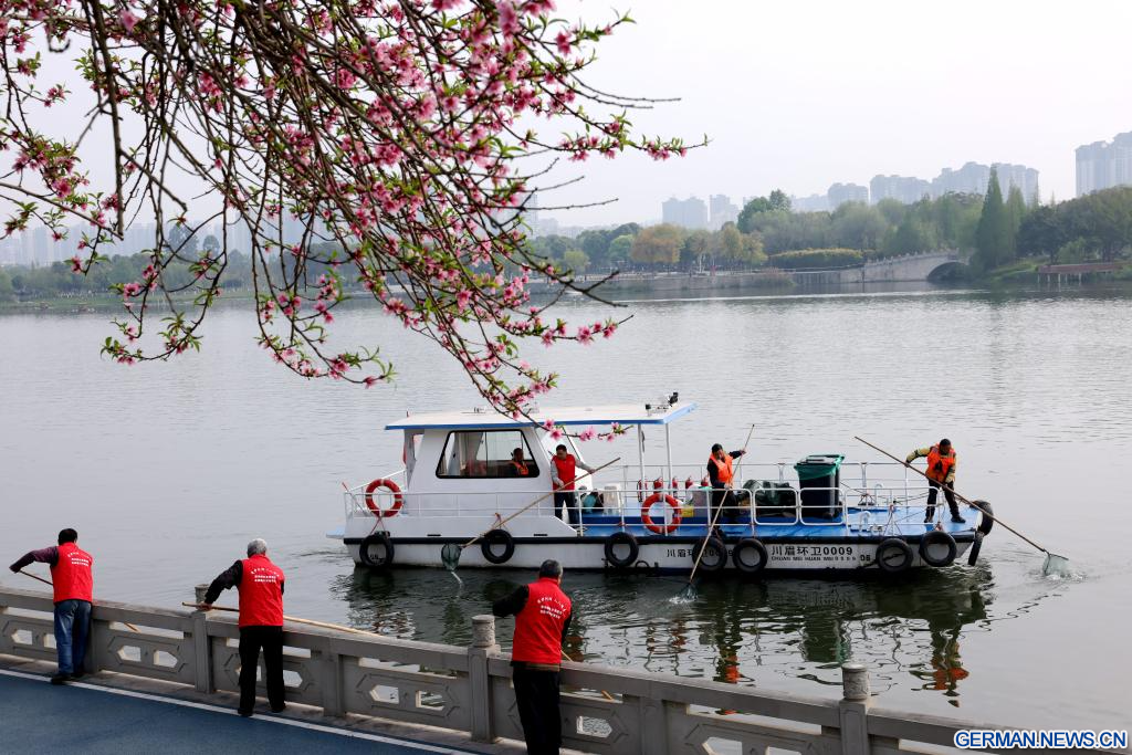 BEIJING, 22. März 2026 (Xinhuanet) -- Arbeiter und Freiwillige sammeln in Meishan in der südwestchinesischen Provinz Sichuan Schwimmkörper von der Wasseroberfläche ein, 21. März 2026. Der Weltwassertag fällt auf den 22. März. (Foto von Yao Yongliang/Xinhua)