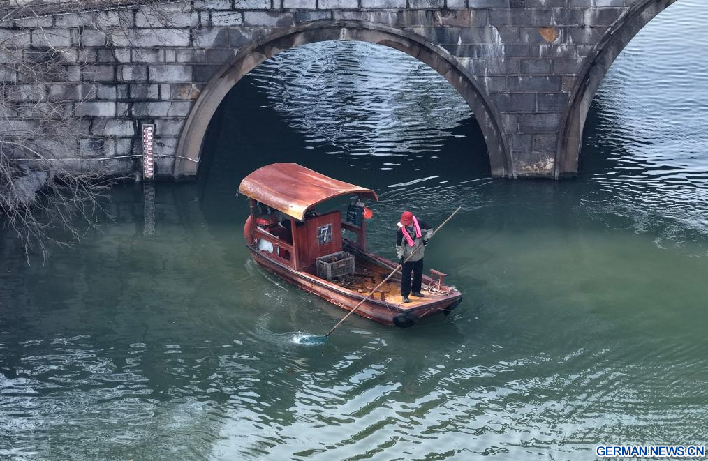 BEIJING, 22. März 2026 (Xinhuanet) -- Die Luftaufnahme einer Drohne zeigt einen Arbeiter, der am Schlanken Westsee in Yangzhou in der ostchinesischen Provinz Jiangsu Schwimmkörper von der Wasseroberfläche einsammelt, 22. März 2026. Der Weltwassertag fällt auf den 22. März. (Foto von Meng Delong/Xinhua)