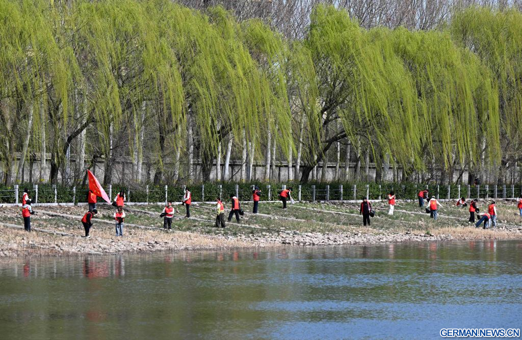 BEIJING, 22. März 2026 (Xinhuanet) -- Die Freiwilligen sammeln an einem Flussufer in Shijiazhuang in der nordchinesischen Provinz Hebei Müll ein, 22. März 2026. Der Weltwassertag fällt auf den 22. März. (Foto von Chen Qibao/Xinhua)
