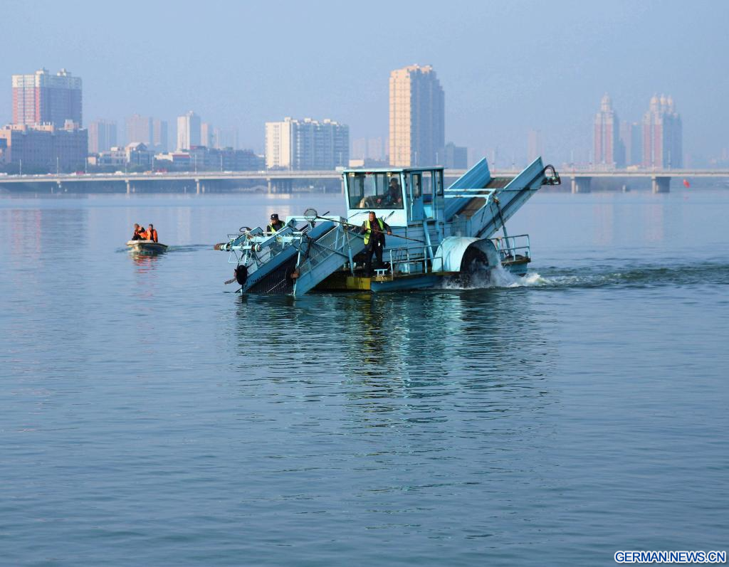 BEIJING, 22. März 2026 (Xinhuanet) -- Arbeiter entfernen in Nanyang in der zentralchinesischen Provinz Henan Urkraut aus dem Fluss, 22. März 2026. Der Weltwassertag fällt auf den 22. März. (Foto von Gao Song/Xinhua)