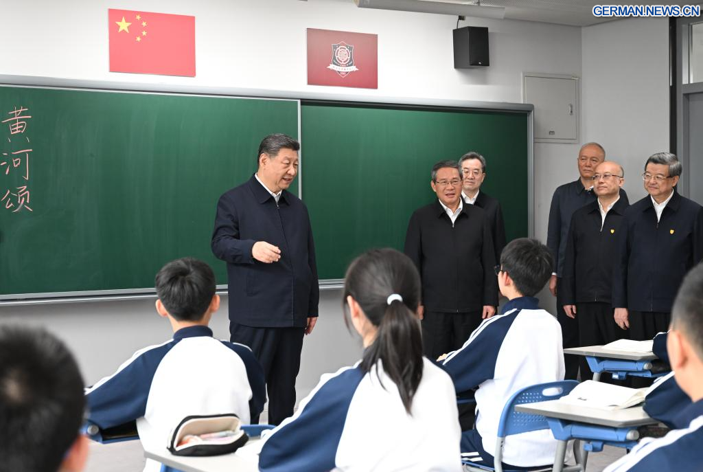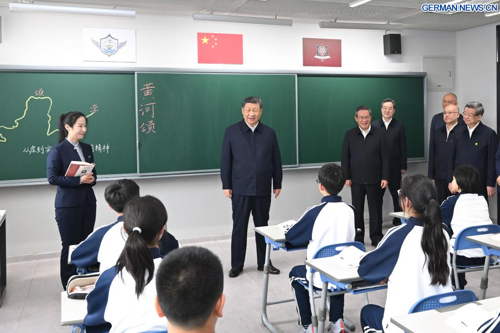 XIONG'AN, 23. März 2026 (Xinhuanet) -- Der chinesische Staatspräsident Xi Jinping, ebenfalls Generalsekretär des Zentralkomitees der Kommunistischen Partei Chinas und Vorsitzender der Zentralen Militärkommission, besucht den Xiong'an-Campus der Beijing No. 4 High School in der Xiong'an New Area in der nordchinesischen Provinz Hebei, 23. März 2026. Xi inspizierte am Montag die Xiong'an New Area und übernahm zugleich den Vorsitz eines Symposiums zur weiteren Förderung des qualitativ hochwertigen Aufbaus und der Entwicklung der Xiong'an New Area. (Quelle: Xinhua/Yan Yan)