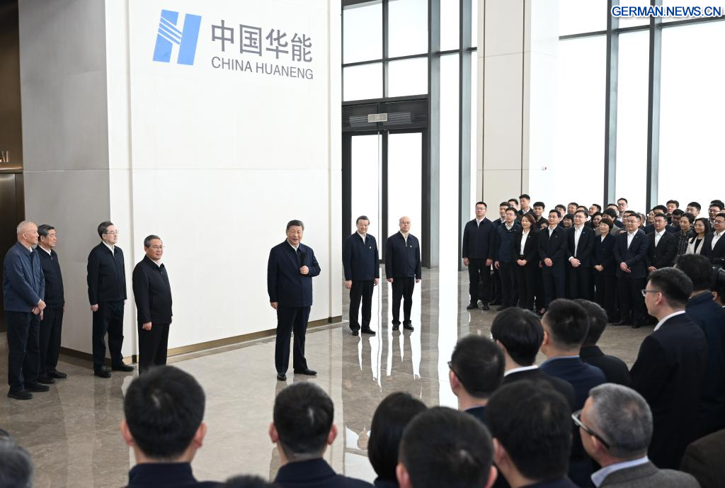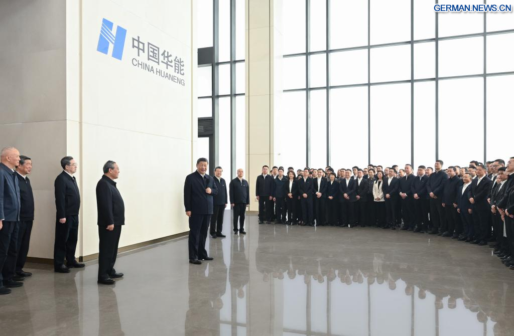 XIONG'AN, 23. März 2026 (Xinhuanet) -- Der chinesische Staatspräsident Xi Jinping, ebenfalls Generalsekretär des Zentralkomitees der Kommunistischen Partei Chinas und Vorsitzender der Zentralen Militärkommission, besucht die China Huaneng Group Co., Ltd. in der Xiong'an New Area in der nordchinesischen Provinz Hebei, 23. März 2026. Xi inspizierte am Montag die Xiong'an New Area und übernahm zugleich den Vorsitz eines Symposiums zur weiteren Förderung des qualitativ hochwertigen Aufbaus und der Entwicklung der Xiong'an New Area. (Quelle: Xinhua/Xie Huanchi)