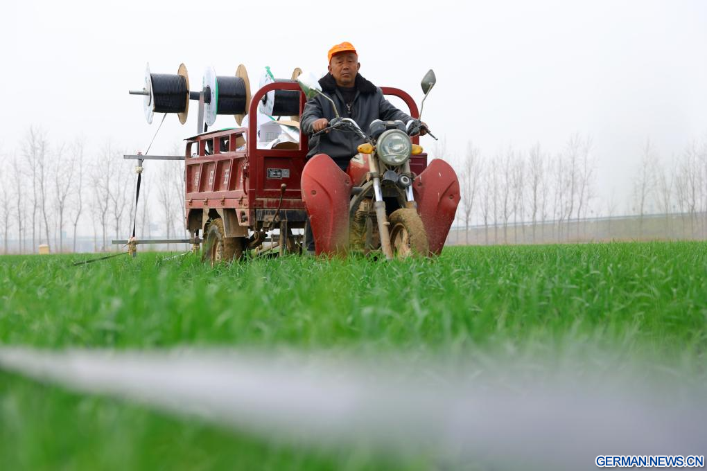 JINAN, 23. März 2026 (Xinhuanet) -- Bauern bewässern den Winterweizen in der Gemeinde Gaocheng im Kreis Gaoqing in der Stadt Zibo in der ostchinesischen Provinz Shandong, 23. März 2026. Nach der Frühlings-Tagundnachtgleiche nutzen die Bauern in ganz Shandong die Anbausaison für die Frühjahrsbestellung. (Foto von Zhang Weitang/Xinhua)