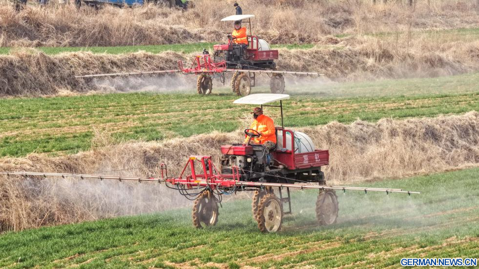 JINAN, 23. März 2026 (Xinhuanet) -- Bauern düngen die Weizenfelder in der Gemeinde Hushan in der Stadt Rongcheng in der ostchinesischen Provinz Shandong und führen die Maßnahmen zur Schädlings- und Krankheitsbekämpfung durch, 23. März 2026. Nach der Frühlings-Tagundnachtgleiche nutzen die Bauern in ganz Shandong die Anbausaison für die Frühjahrsbestellung. (Foto von Li Xinjun/Xinhua)
