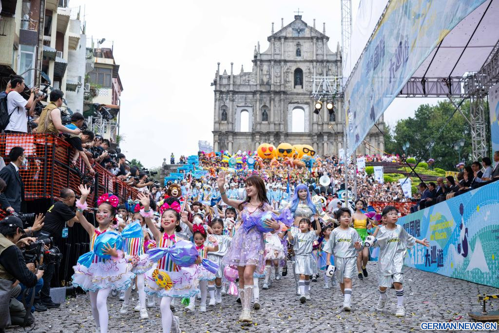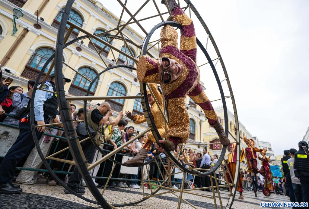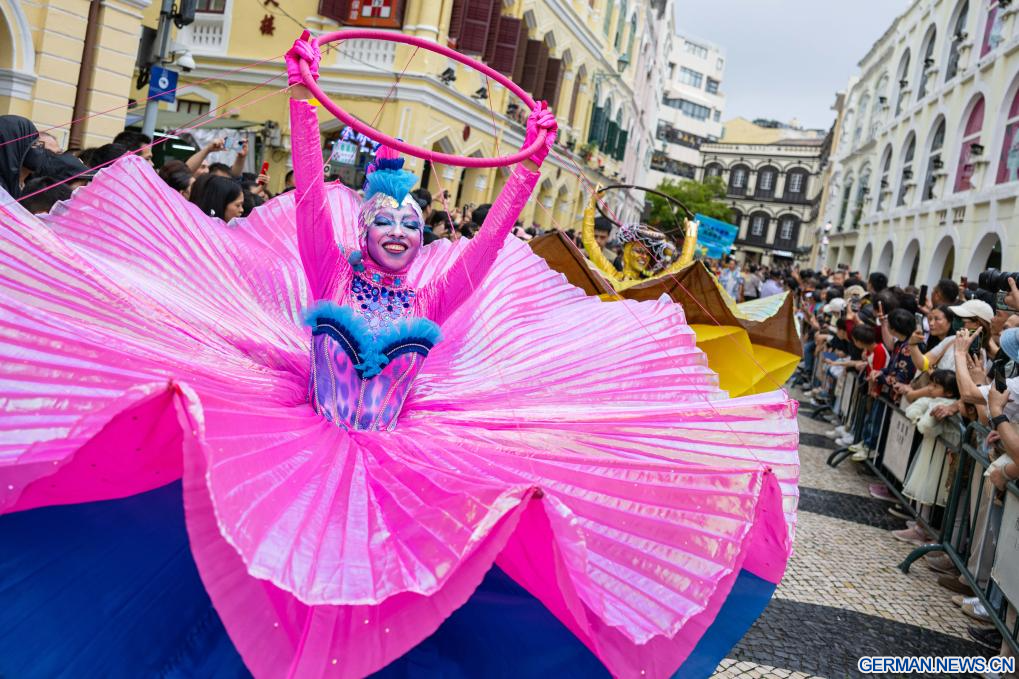 MACAO, 29. März 2026 (Xinhuanet) -- Menschen beteiligen sich an der Macao International Parade 2026 in Südchinas Macao, 29. März 2026. Kunstgruppen aus verschiedenen Ländern und Regionen präsentierten vielfältige künstlerische Darbietungen, zeigten den besonderen Reiz von Macao als Stadt, in der chinesische und westliche Kulturen miteinander verschmelzen, und sorgten für eine festliche Atmosphäre für die Parade. (Quelle: Xinhua/Cheong Kam Ka)