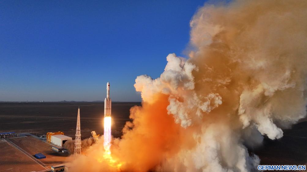 JIUQUAN, 30. März 2026 (Xinhuanet) -- Eine Trägerrakete vom Typ „Lijian-2 Y1“ mit drei Satelliten an Bord startet von der Pilotzone Dongfeng für kommerzielle Raumfahrtinnovationen im Nordwesten Chinas, 30. März 2026. Die Rakete startete um 19:00 Uhr Ortszeit Beijing von einer Pilotzone für kommerzielle Raumfahrtinnovationen im Nordwesten Chinas und brachte die Satelliten erfolgreich in die geplante Umlaufbahn. (Foto von Wang Jiangbo/Xinhua)
