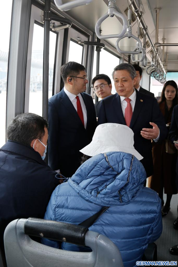 PJÖNGJANG, 30. März 2026 (Xinhuanet) -- Wang Yajun (3. v. l., oben), chinesischer Botschafter in der Demokratischen Volksrepublik Korea (DVRK), unterhält sich mit anderen Reisenden in einem Shuttlebus am internationalen Flughafen Sunan in Pjöngjang, der DVRK, 30. März 2026. Ein Passagierflugzeug der Air China aus Beijing landete am Montagmorgen in Pjöngjang, womit der Passagierflugverkehr der chinesischen Fluggesellschaft zwischen den Hauptstädten Chinas und der DVRK offiziell wieder aufgenommen wurde. (Quelle: Xinhua/Wang Chao)