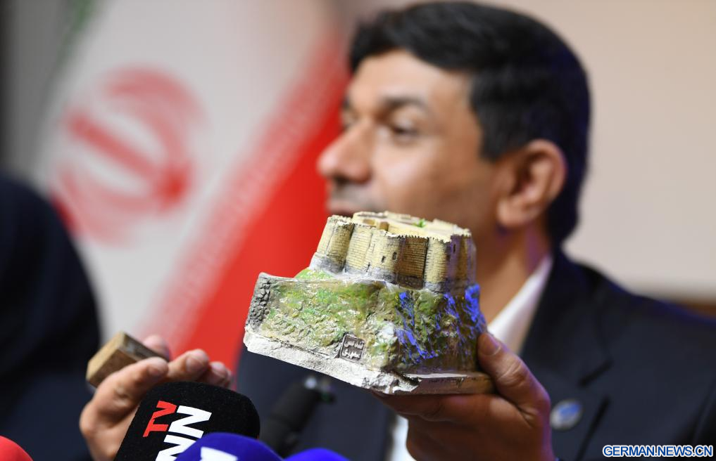 TEHERAN, 1. April 2026 (Xinhua) -- Hassan Fartousi, Generalsekretär der iranischen Nationalkommission für die UNESCO, zeigt während einer Pressekonferenz in Teheran im Iran eine Miniatur des Falak-ol-Aflak-Schlosses, das durch US-amerikanische und israelische Luftangriffe beschädigt wurde, 31. März 2026. Fartousi sagte am Dienstag, dass US-amerikanische und israelische Luftangriffe mehrere historische Gebäude zerstört und Universitäten im gesamten Iran beschädigt hätten. (Xinhua/Sha Dati)