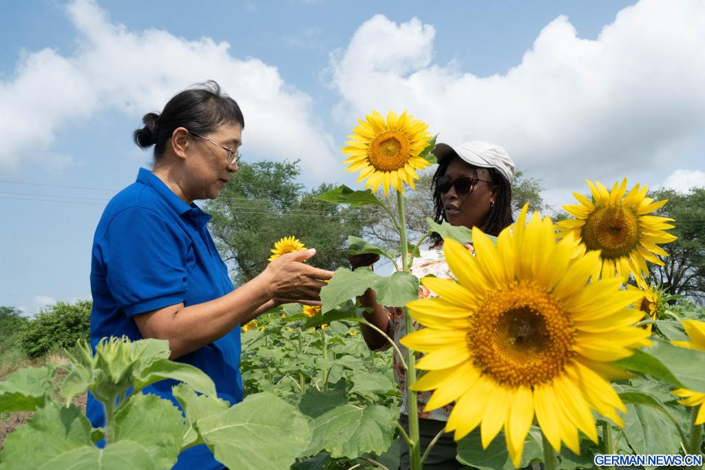 MAPUTO, 1. April 2026 (Xinhuanet) -- Zhao Jun (links), eine Expertin für Ölpflanzen aus der vierten Gruppe der chinesischen Landwirtschaftsexperten, die Mosambik unterstützen, erläutert einer lokalen Technikerin auf der Landwirtschaftsstation Umbeluzi in der Provinz Maputo in Mosambik die Techniken zum Sonnenblumenanbau, 27. März 2026. (Quelle: Xinhua/Liu Jie)