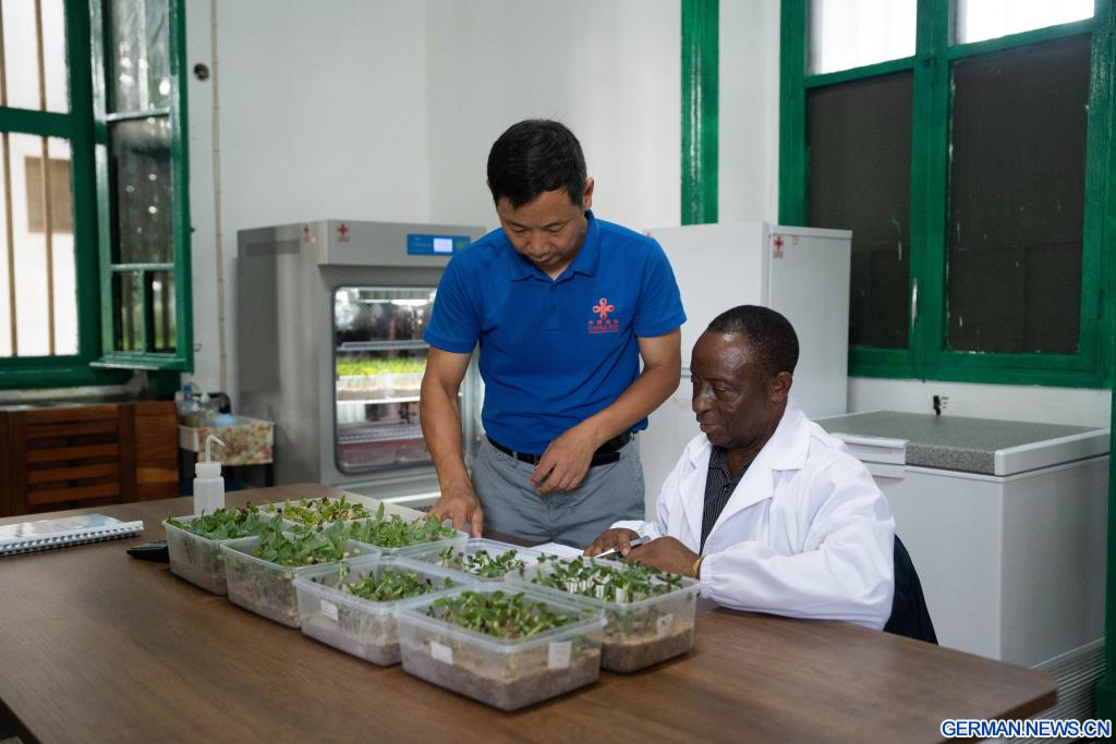 MAPUTO, 1. April 2026 (Xinhuanet) -- Wu Guiyun (links), ein Experte für Saatgutproduktion und Qualitätsprüfung aus der vierten Gruppe der chinesischen Landwirtschaftsexperten, die Mosambik unterstützen, bringt einem lokalen Techniker auf der Landwirtschaftsstation Umbeluzi in der Provinz Maputo in Mosambik die Techniken zur Saatgutzüchtung bei, 27. März 2026. (Quelle: Xinhua/Liu Jie)