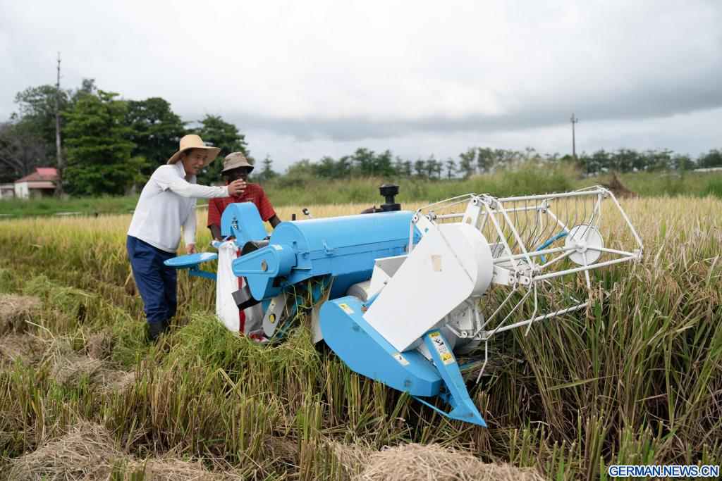 MAPUTO, 1. April 2026 (Xinhuanet) -- Li Yuhao (l.), ein Experte für Reis und landwirtschaftliche Verarbeitung aus der vierten Gruppe der chinesischen Landwirtschaftsexperten, die Mosambik unterstützen, leitet einen lokalen landwirtschaftlichen Techniker auf der Landwirtschaftsstation Umbeluzi in der Provinz Maputo in Mosambik bei der Bedienung einer Erntemaschine an, 19. März 2026. (Quelle: Xinhua/Liu Jie)