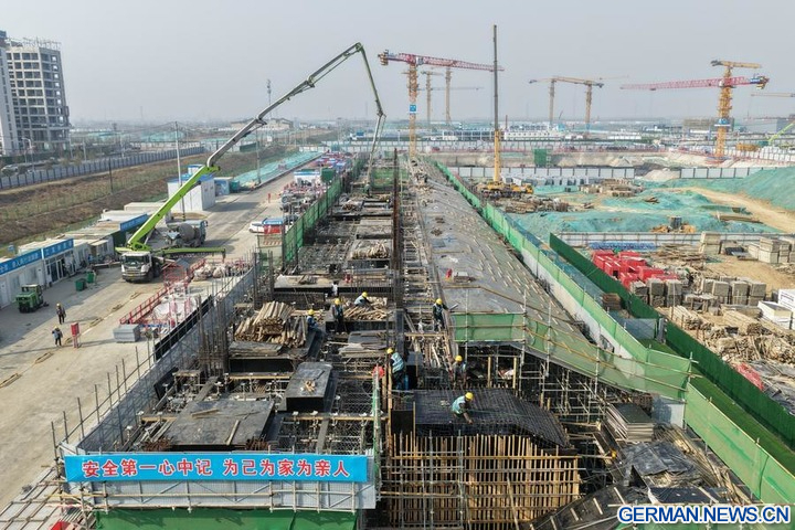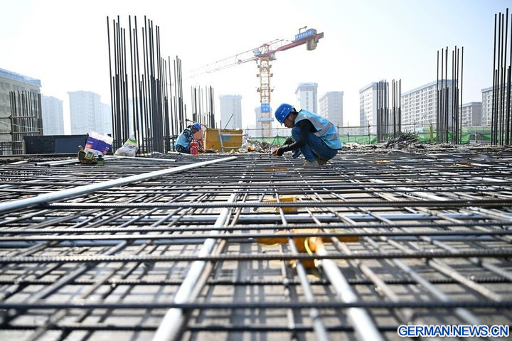 Mitarbeiter der China Construction Third Engineering Bureau Group Co., Ltd. arbeiten auf der Baustelle des Hauptsitzes der China Mineral Resources Group Ltd. in der Xiong'an New Area in der nordchinesischen Provinz Hebei, 25. März 2026 (Xinhua/Mu Yu)