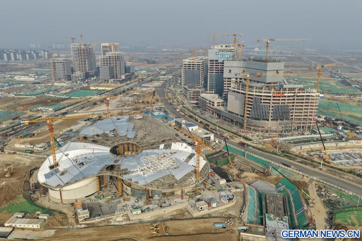 Die Luftaufnahme einer Drohne zeigt die Baustelle eines städtischen Kulturplatzes in der Xiong'an New Area in der nordchinesischen Provinz Hebei, 25. März 2026. (Xinhua/Mu Yu)