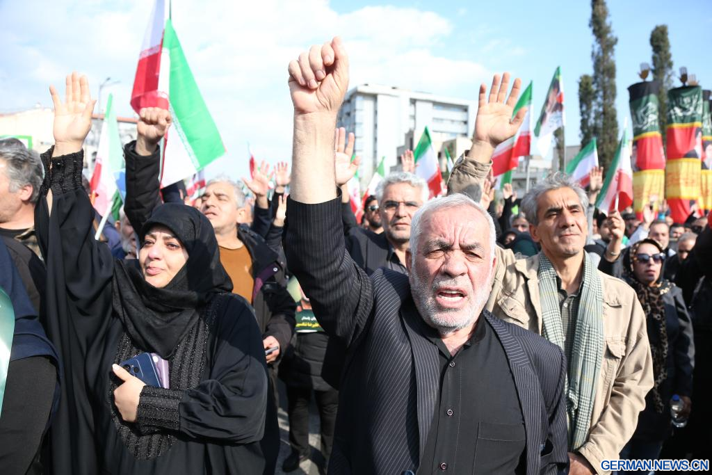 TEHERAN, 1. April 2026 (Xinhuanet) -- Menschen nehmen an einer Beerdigungszeremonie in Teheran im Iran teil, 1. April 2026. Am Mittwoch versammelten sich Iraner in Teheran, um an einer Beerdigungszeremonie für Alireza Tangsiri, den Oberbefehlshaber der Marine des Korps der Islamischen Revolutionsgarden (IRGC), und weitere Angehörige der Streitkräfte teilzunehmen, die bei den jüngsten Angriffen der USA und Israels ums Leben gekommen waren. (Quelle: Xinhua/Shadati)