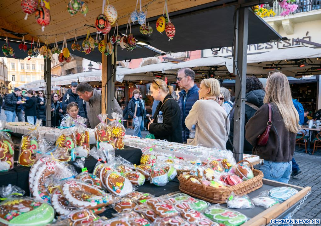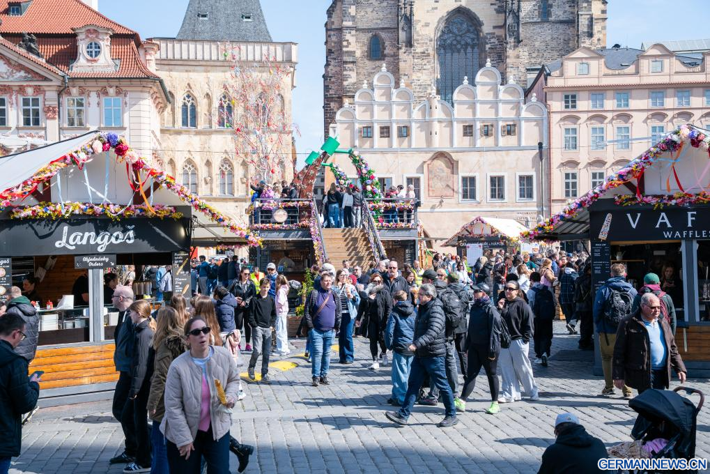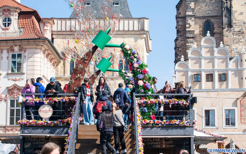 PRAG, 2. April 2026 (Xinhuanet) -- Das Foto zeigt Besucher auf einem Ostermarkt in Prag, der Tschechischen Republik, 2. April 2026. Kurz vor Ostern findet in der Altstadt von Prag ein Markt statt, der Stadtbewohner und Touristen anzieht, um die festliche Atmosphäre zu genießen. (Foto von Dana Kesnerova/Xinhua)