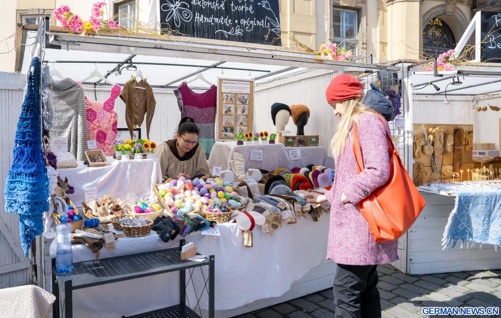 PRAG, 2. April 2026 (Xinhuanet) -- Das Foto zeigt eine Frau auf dem Ostermarkt in Prag, der Tschechischen Republik, 2. April 2026. Kurz vor Ostern findet in der Altstadt von Prag ein Markt statt, der Stadtbewohner und Touristen anzieht, um die festliche Atmosphäre zu genießen. (Foto von Dana Kesnerova/Xinhua)