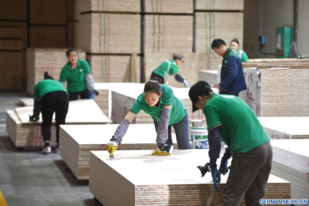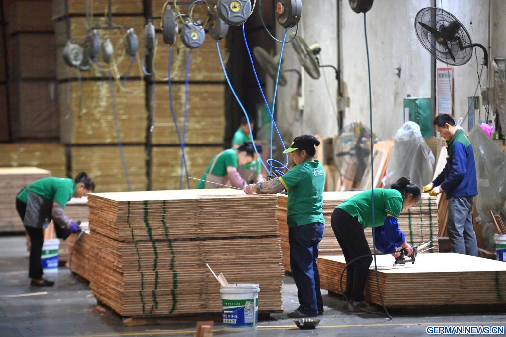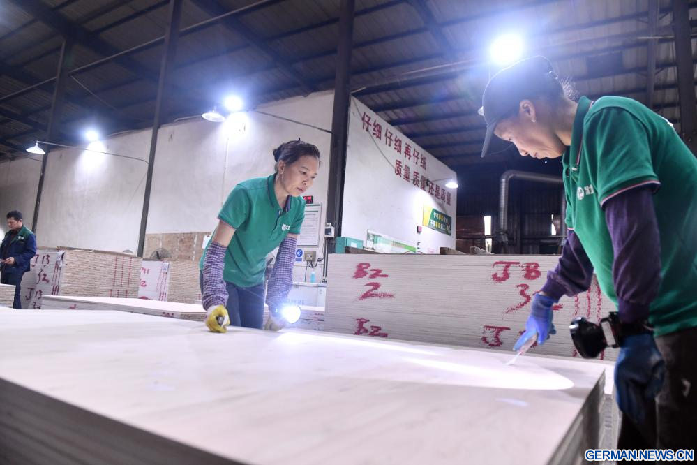 LIUZHOU, 2. April 2026 (Xinhuanet) -- Das Foto zeigt die Arbeiter an einem Fließband in einer Holzplattenfabrik im Kreis Rong'an in Liuzhou im südchinesischen Autonomen Gebiet Guangxi der Zhuang, 1. April 2026. In den vergangenen Jahren hat der Kreis Rong'an seine hochqualitativen Ressourcen an chinesischen Tannen voll genutzt, um die Wiederbelebung des ländlichen Raums voranzutreiben. Durch die Integration von Sämlingszucht, Anpflanzung, Holzverarbeitung und ländlichem Tourismus hat sich die mit chinesischen Tannen verbundene Industrie zu einem tragenden Wirtschaftszweig im Kreis Rong'an entwickelt und mehr als 20.000 Arbeitsplätze für lokale Bewohner geschaffen. (Quelle: Xinhua/Huang Xiaobang)