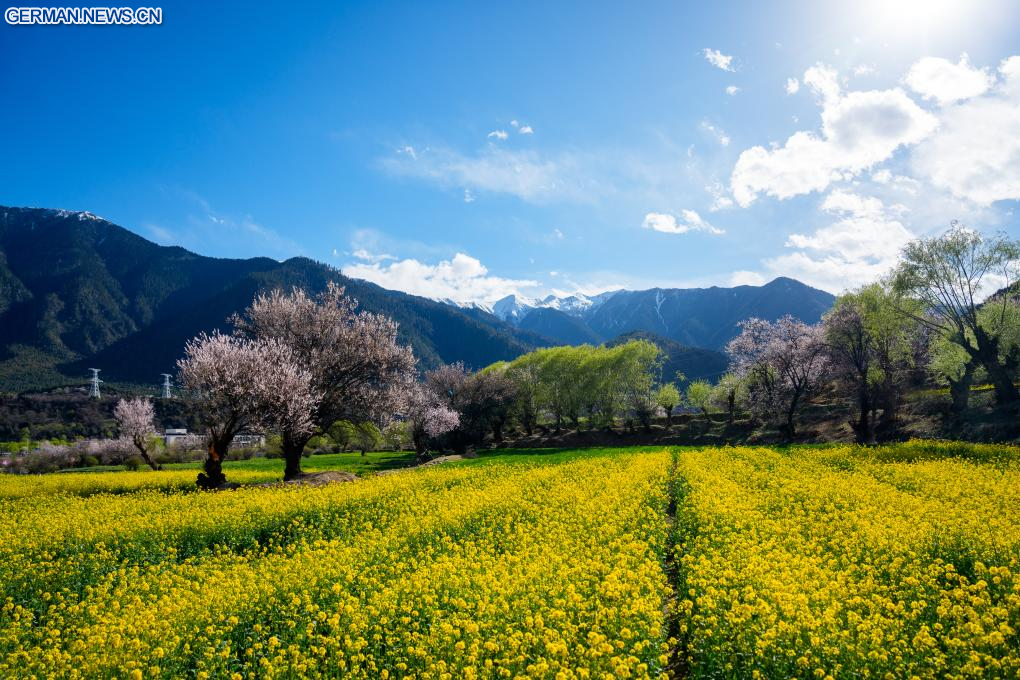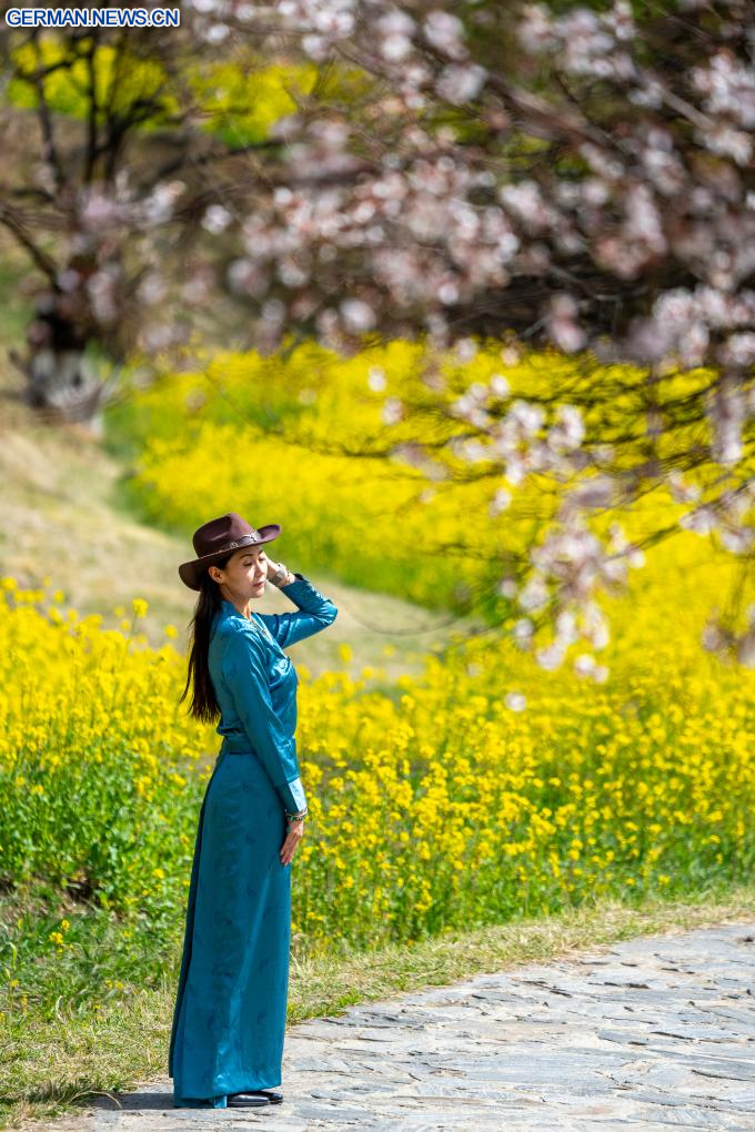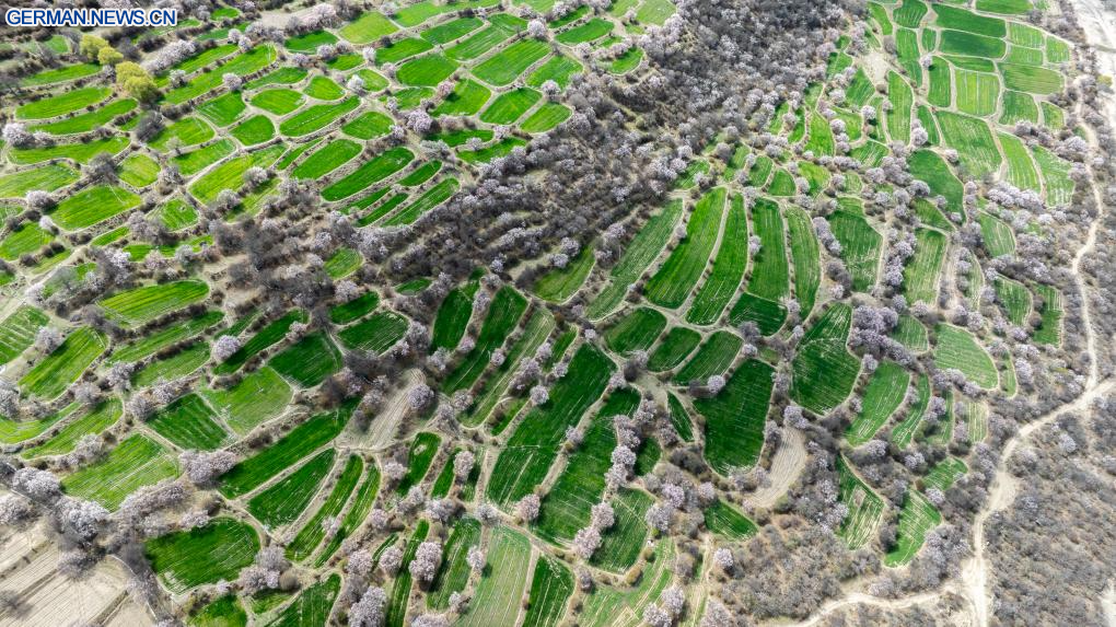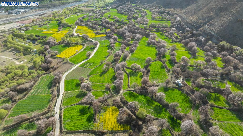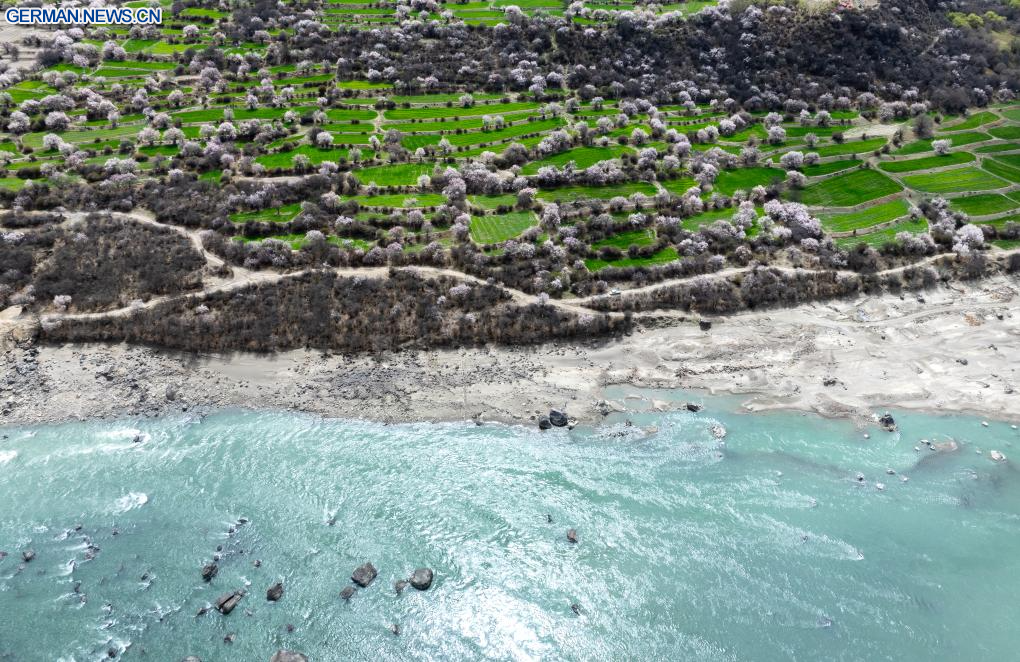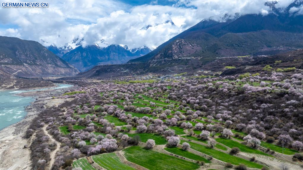 LHASA, 3. April 2026 (Xinhuanet) -- Die Luftaufnahme einer Drohne vom 3. April 2026 zeigt eine Ansicht von Pfirsichblüten in Nyingchi im Autonomen Gebiet Xizang im Südwesten Chinas. Mit steigenden Temperaturen stehen die Pfirsichbäume in Nyingchi in voller Blüte und ziehen zahlreiche Touristen an. (Quelle: Xinhua/Tenzin Nyida)