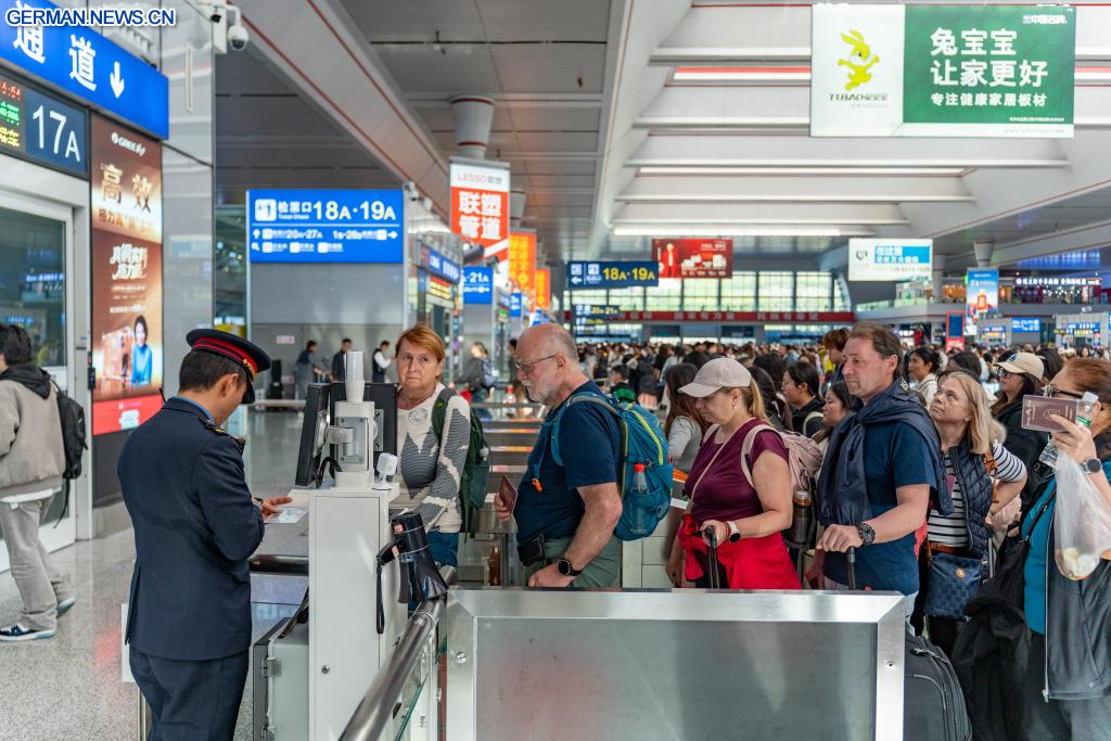 BEIJING, 3. April 2026 (Xinhuanet) -- Ausländische Reisende checken am Nordbahnhof von Guiyang in der südwestchinesischen Provinz Guizhou ein, 3. April 2026. (Foto von Long Jianrui/Xinhua)