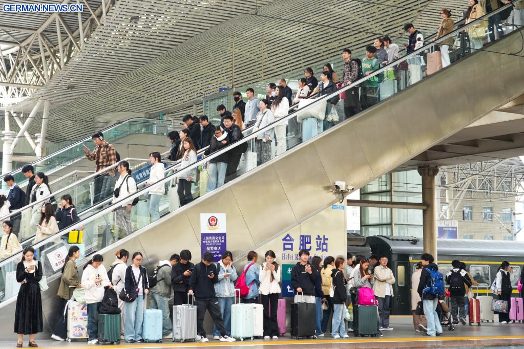 BEIJING, 3. April 2026 (Xinhuanet) -- Reisende sind auf einem Bahnsteig des Bahnhofs Hefei in Hefei in der ostchinesischen Provinz Anhui zu sehen, 3. April 2026. Nach Angaben des staatlichen Eisenbahnbetreibers wird China von Freitag bis zum kommenden Dienstag während des bevorstehenden Reiseansturms zu den Feiertagen des Qingming-Festes voraussichtlich 90,5 Millionen Fahrgastfahrten im Eisenbahnverkehr verzeichnen.