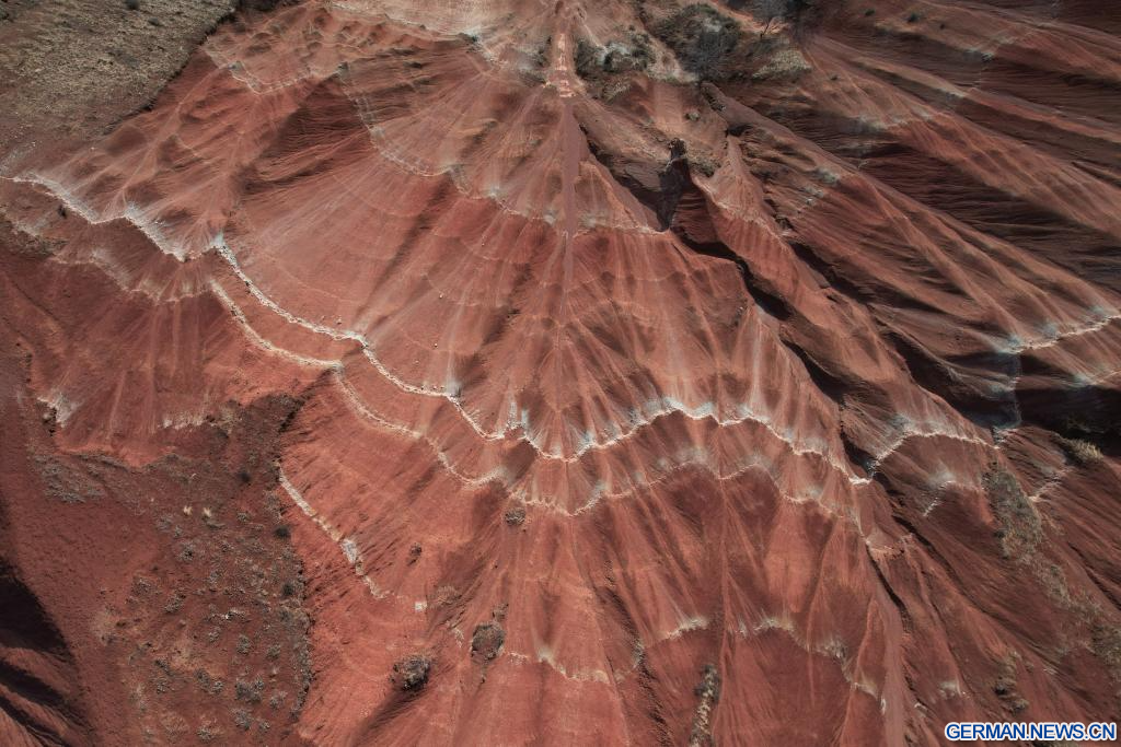 DONGXIANG, 4. April 2026 (Xinhuanet) -- Die Luftaufnahme einer Drohne vom 3. April 2026 zeigt einen Blick auf die Danxia-Landschaft in der Gemeinde Dongyuan im Autonomen Kreis Dongxiang der Autonomen Präfektur Linxia der Hui in der nordwestchinesischen Provinz Gansu. (Quelle: Xinhua/Zhang Zhimin)