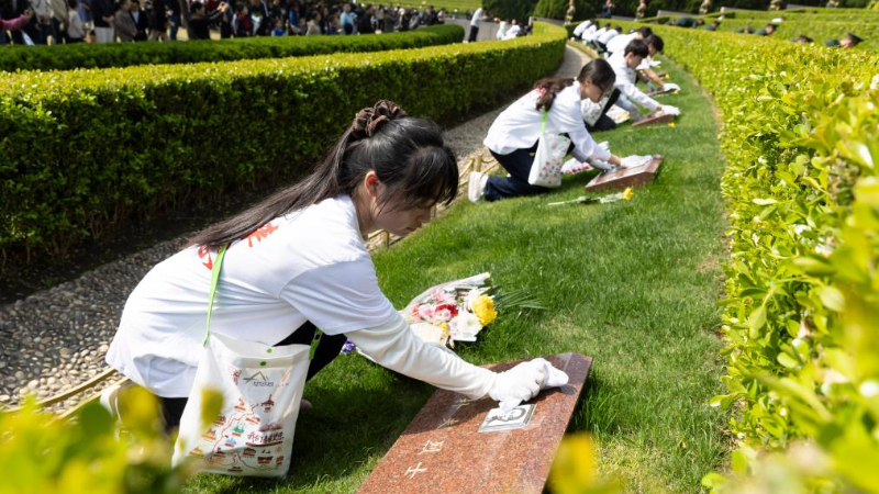 BEIJING, 5. April 2026 (Xinhuanet) -- Schüler reinigen die Grabsteine der Märtyrer auf dem Longhua-Revolutionsmärtyrerfriedhof im ostchinesischen Shanghai, 5. April 2026. Menschen im ganzen Land nahmen an diesem Sonntag an verschiedenen Aktivitäten teil, um während des Qingming-Festes, auch bekannt als Tag des Grabfegens, der Märtyrer zu gedenken. (Quelle: Xinhua/Wang Xiang)