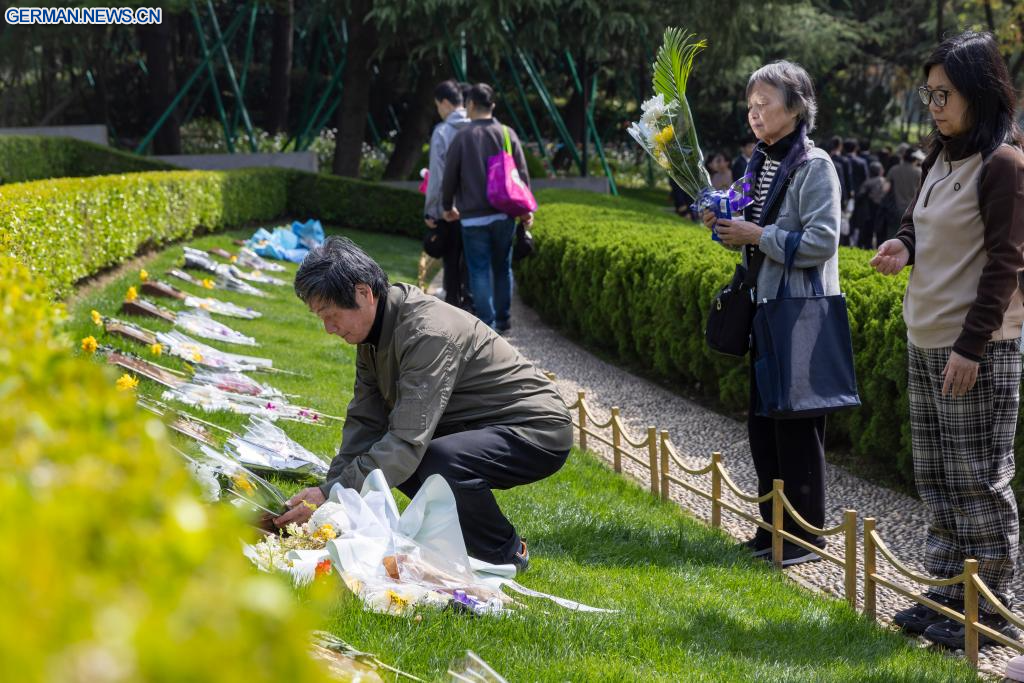 BEIJING, 5. April 2026 (Xinhuanet) -- Menschen gedenken der Märtyrer auf dem Longhua-Revolutionsmärtyrerfriedhof im ostchinesischen Shanghai, 5. April 2026. Menschen im ganzen Land nahmen an diesem Sonntag an verschiedenen Aktivitäten teil, um während des Qingming-Festes, auch bekannt als Tag des Grabfegens, der Märtyrer zu gedenken. (Quelle: Xinhua/Wang Xiang)