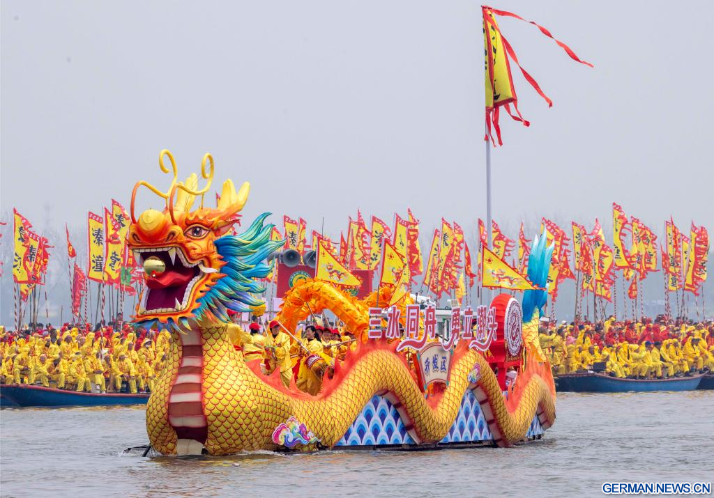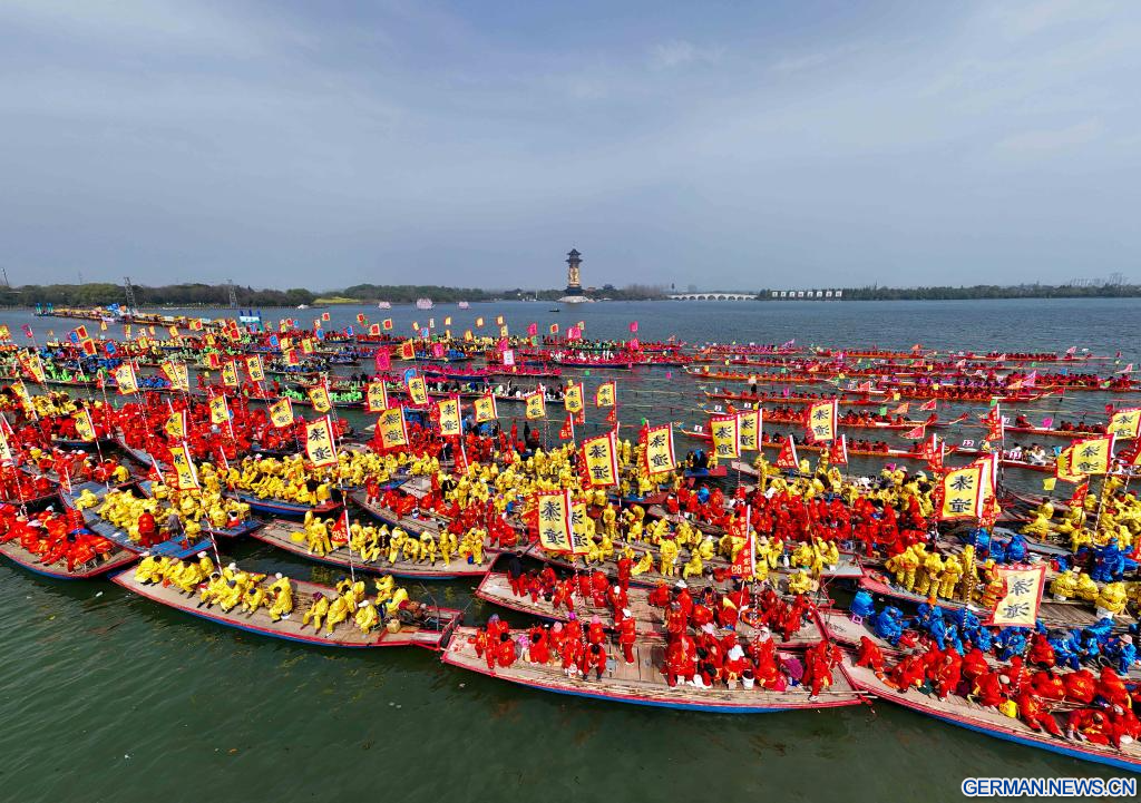 TAIZHOU, 6. April 2026 (Xinhuanet) -- Die Drohnenaufnahme vom 6. April 2026 zeigt Boote beim Wettbewerb des Qintong-Bootsfestivals im Nationalen Feuchtgebietspark Qinhu in der Gemeinde Qintong in der Stadt Taizhou in der ostchinesischen Provinz Jiangsu. Das Qintong-Bootsfestival hat seinen antiken Ursprung in der chinesischen Südlichen Song-Dynastie (1127–1279) und wird zur Erinnerung an Vorfahren sowie historische Helden abgehalten. Hunderte von Booten mit mehr als 10.000 Ruderern an Bord versammelten sich hier am Montag zum diesjährigen Festival, bei dem jedes Boot an einem Wettrennen teilnahm. Dieses jahrhundertealte große Wasserfest wurde als eines der nationalen immateriellen Kulturerbe des Landes anerkannt. (Foto von Tang Dehong/Xinhua)