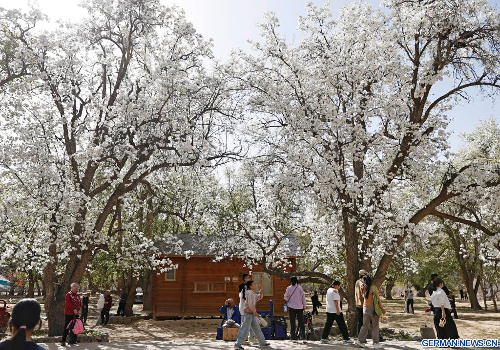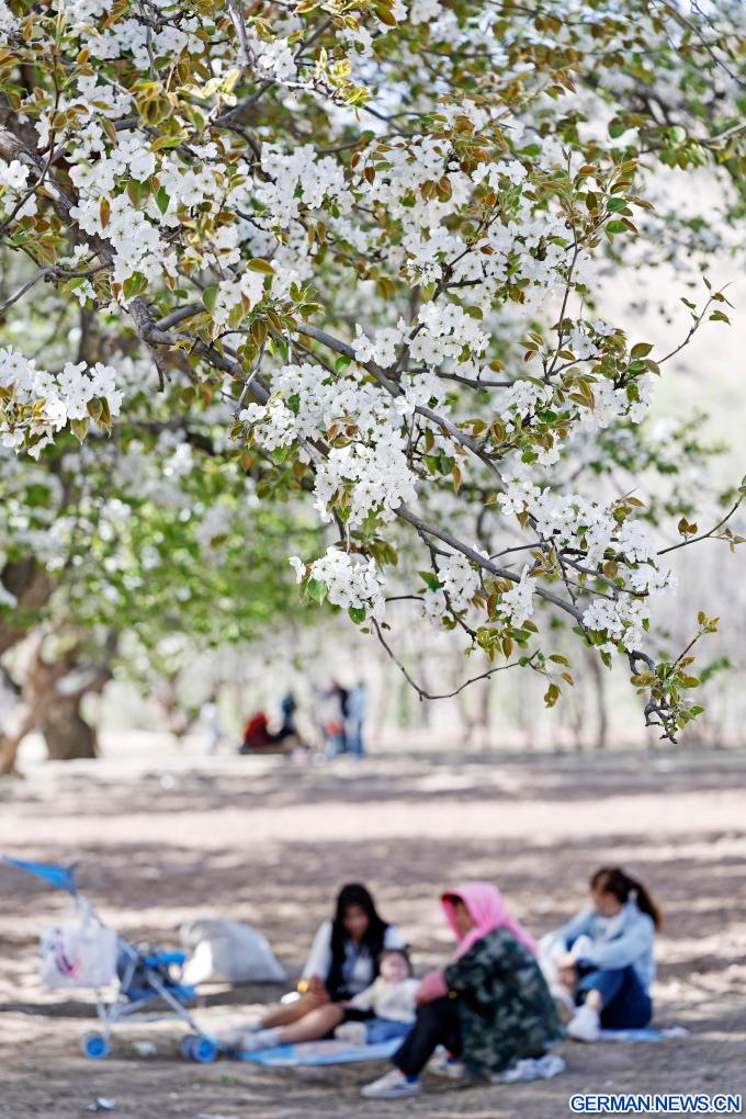 ZHONGWEI, 7. April 2026 (Xinhuanet) -- Touristen genießen ihre Freizeit unter den voll blühenden Birnbäumen im Dorf Nanchangtan in Zhongwei im Autonomen Gebiet Ningxia der Hui im Nordwesten Chinas, 6. April 2026.