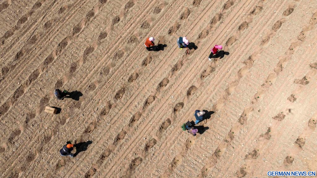ZHONGWEI, 7. April 2026 (Xinhuanet) -- Bauern pflanzen Xisha-Wassermelonen in der Gemeinde Xingren im Bezirk Shapotou in der Stadt Zhongwei im nordwestchinesischen Autonomen Gebiet Ningxia der Hui, 6. April 2026.