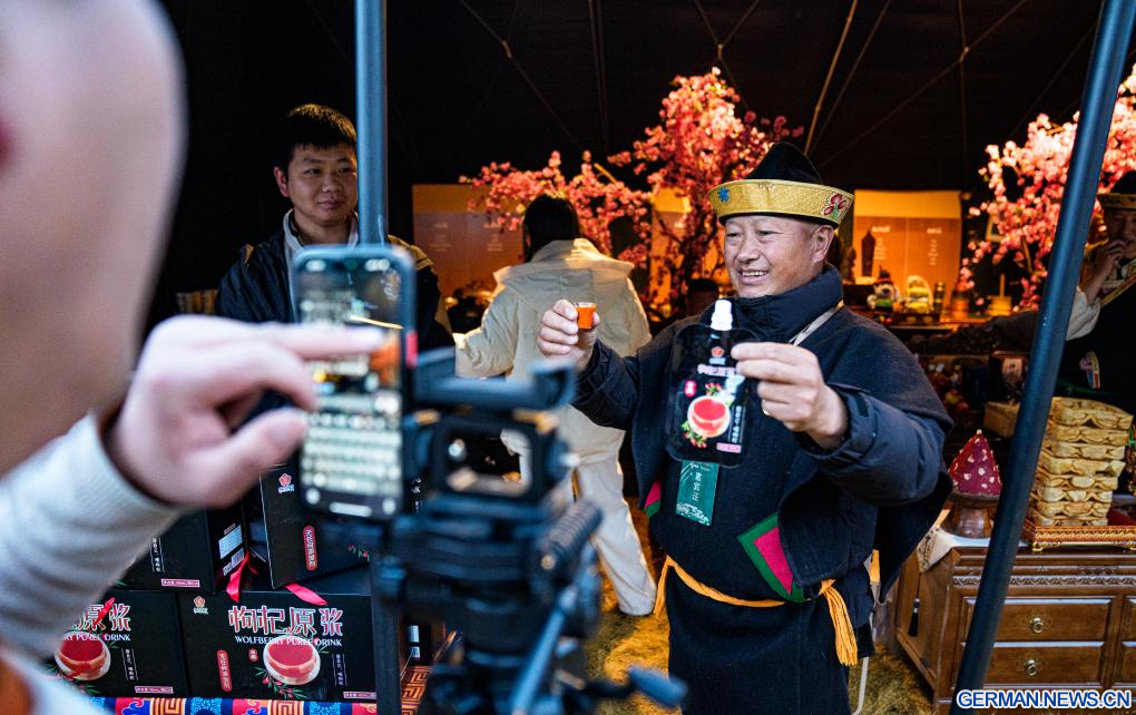 NYINGCHI, 8. April 2026 (Xinhuanet) -- Ein Mitarbeiter wirbt für Goji-Beeren-Püree-Produkte auf einem Markt in der Stadt Nyingchi im südwestchinesischen Autonomen Gebiet Xizang, 3. April 2026. (Quelle: Xinhua/Tenzin Nyida)